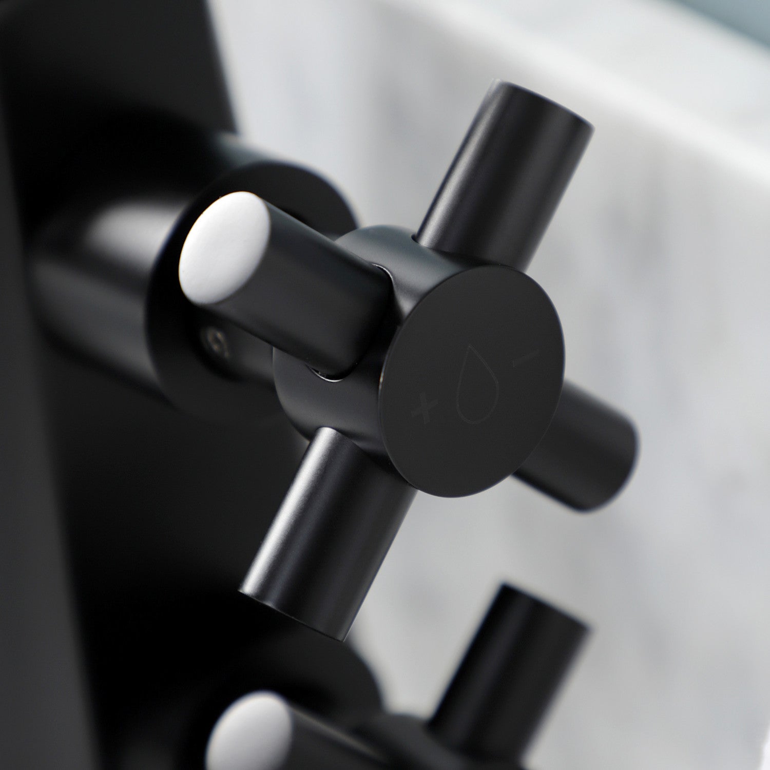 - Top handle controls water flow volume, bottom handle controls temperature