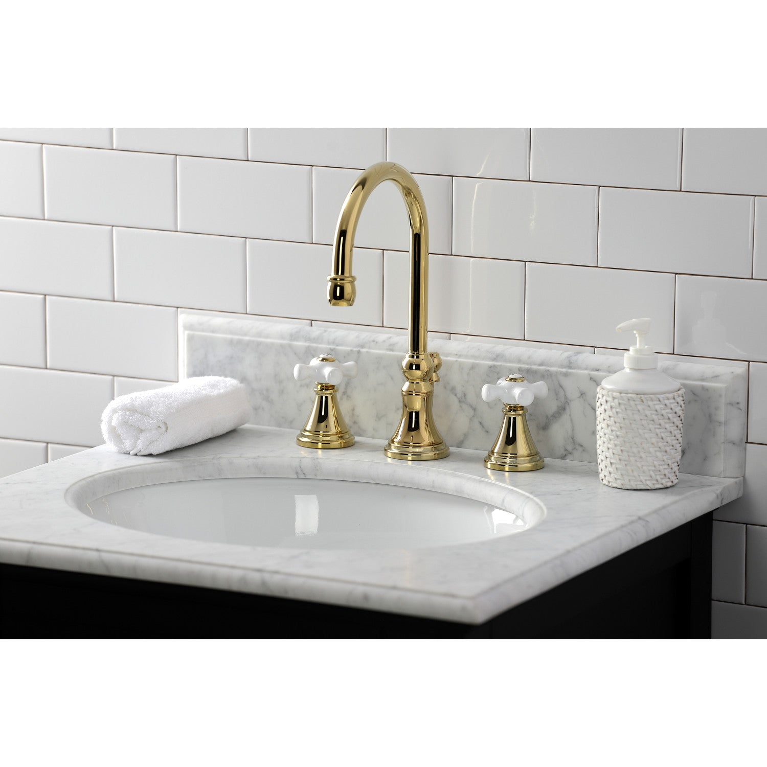 Stylized for excellence in design and performance, this faucet will take your bathroom space to the next level. Ideal for more spacious bathrooms, widespread faucets are more spread apart and feature a 3-hole installation. The Governor 8-inch widespread bathroom faucet and its featured sturdy brass construction and premium polished brass finish are guaranteed to glamorize your home's traditional ensemble for years to come. A matching finish drain is also included.