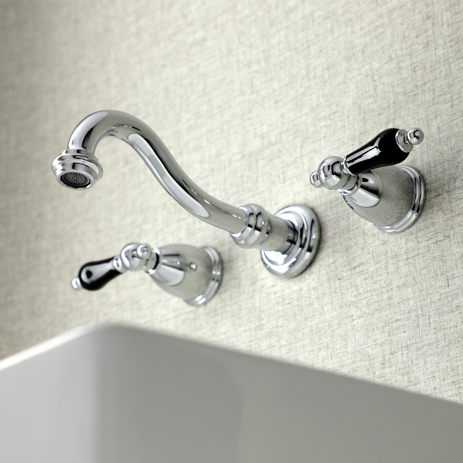 Crafted in commendations to English nobility, the exemplary design of this faucet manifests regality and elegance with its black porcelain handles. Attached to the wall behind your sink, the horizontal pop adds a stunning element to your bathroom design. Clean-up is also made a breeze as counter space is cleared up. The Duchess wall mount bathroom faucet and its featured sturdy brass construction and premium polished chrome finish are guaranteed to glamorize your home's traditional ensemble for years to come. Glamorize your home today with the traditional elegance of this faucet.