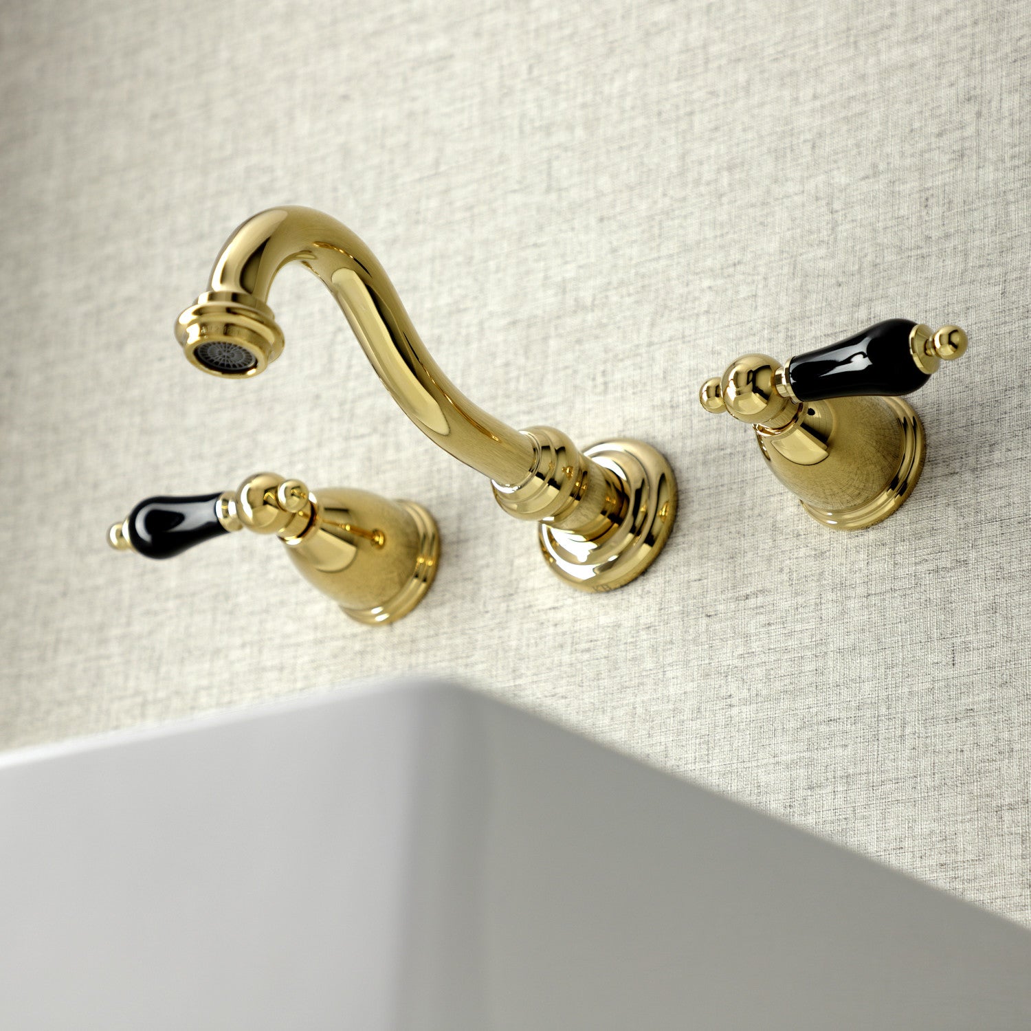 Crafted in commendations to English nobility, the exemplary design of this faucet manifests regality and elegance with its black porcelain handles. Attached to the wall behind your sink, the horizontal pop adds a stunning element to your bathroom design. Clean-up is also made a breeze as counter space is cleared up. The Duchess wall mount bathroom faucet and its featured sturdy brass construction and premium polished brass finish are guaranteed to glamorize your home's traditional ensemble for years to come. Glamorize your home today with the traditional elegance of this faucet.