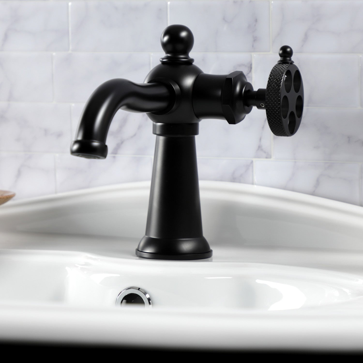 Webb KS3540RKX Single-Handle 1-Hole Deck Mount Bathroom Faucet with Knurled Handle and Push Pop-Up Drain, Matte Black