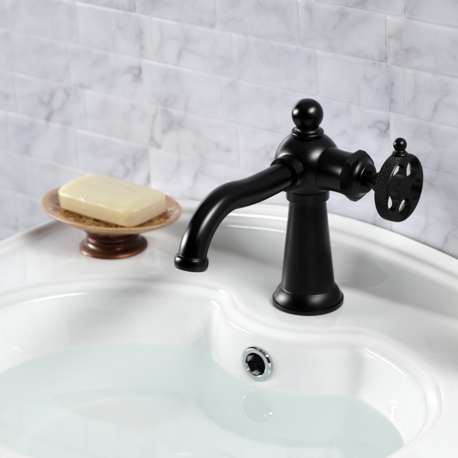 The exquisite design of this faucet tastefully flatters the elegant architecture of traditional homes with its fine detailing. Single-hole bathroom faucets provide a more streamlined look. Also, they will allow your bathroom to appear more spacious with the limited counter space they require. The Webb single-handle bathroom faucet with push pop-up and its featured sturdy brass construction and premium matte black finish are guaranteed to glamorize your home's traditional ensemble for years to come. A matching finish drain is also included.