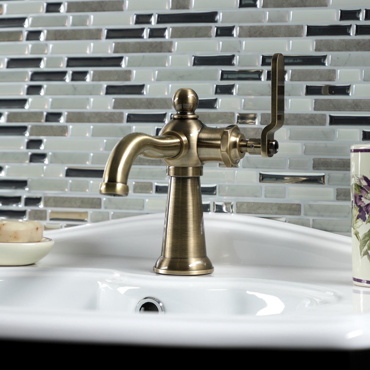 The exquisite design of this faucet tastefully flatters the elegant architecture of traditional homes with its fine detailing. Single-hole bathroom faucets provide a more streamlined look. Also, they will allow your bathroom to appear more spacious with the limited counter space they require. The Knight single-handle bathroom faucet with push pop-up and its featured sturdy brass construction and premium antique brass finish are guaranteed to glamorize your home's traditional ensemble for years to come. A matching finish drain is also included.