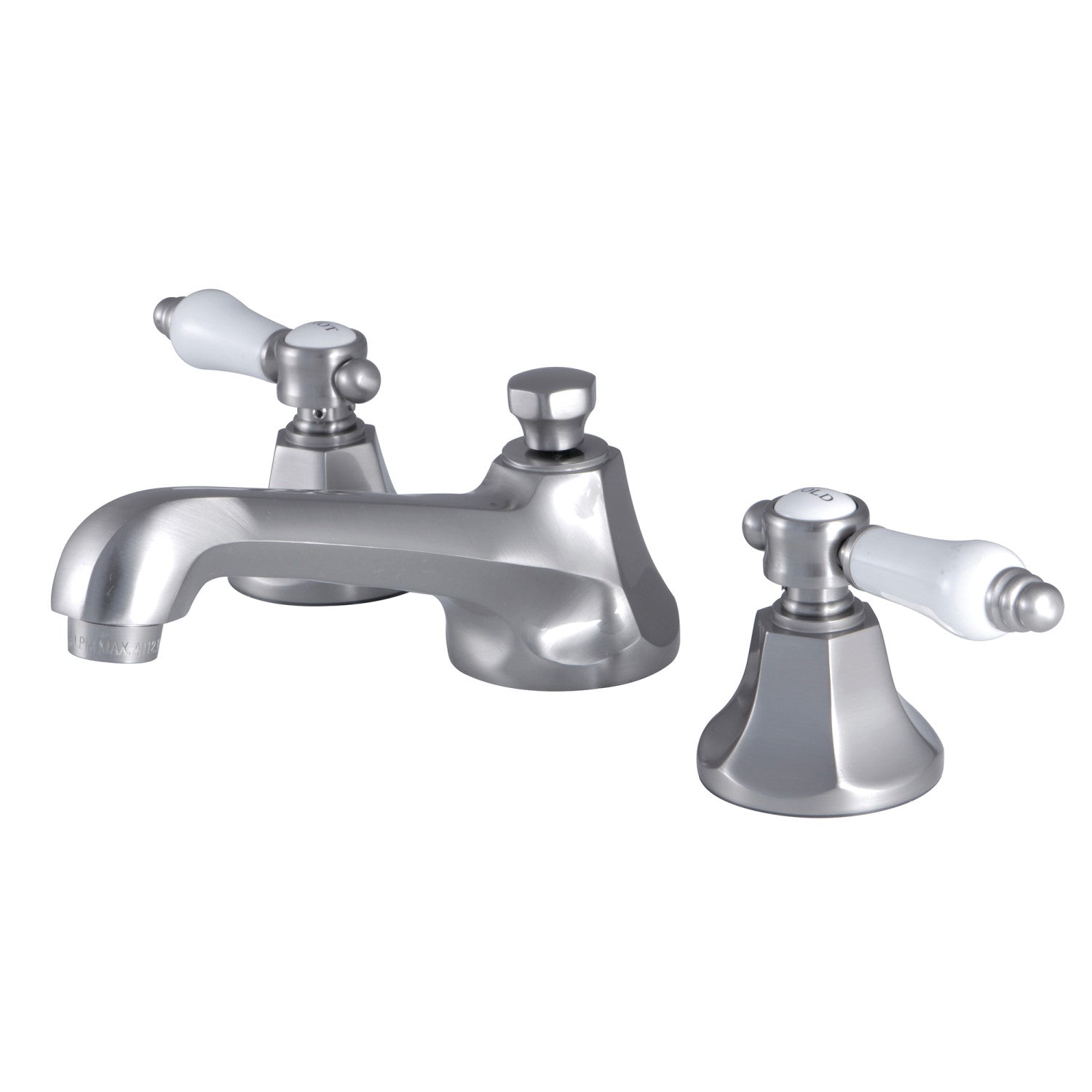 The graceful elegance of timeless design is beautifully merged between British flair and Victorian delicacy within this faucet's white porcelain levers. Ideal for more spacious bathrooms, widespread faucets are more spread apart and feature a 3-hole installation. The Bel-Air 8-inch widespread bathroom faucet with brass pop-up and its featured sturdy brass construction and premium brushed nickel finish are guaranteed to glamorize your home's modern ensemble for years to come. Varnish your bathroom with this state-of-the-art fixture. A matching finish drain is also included.