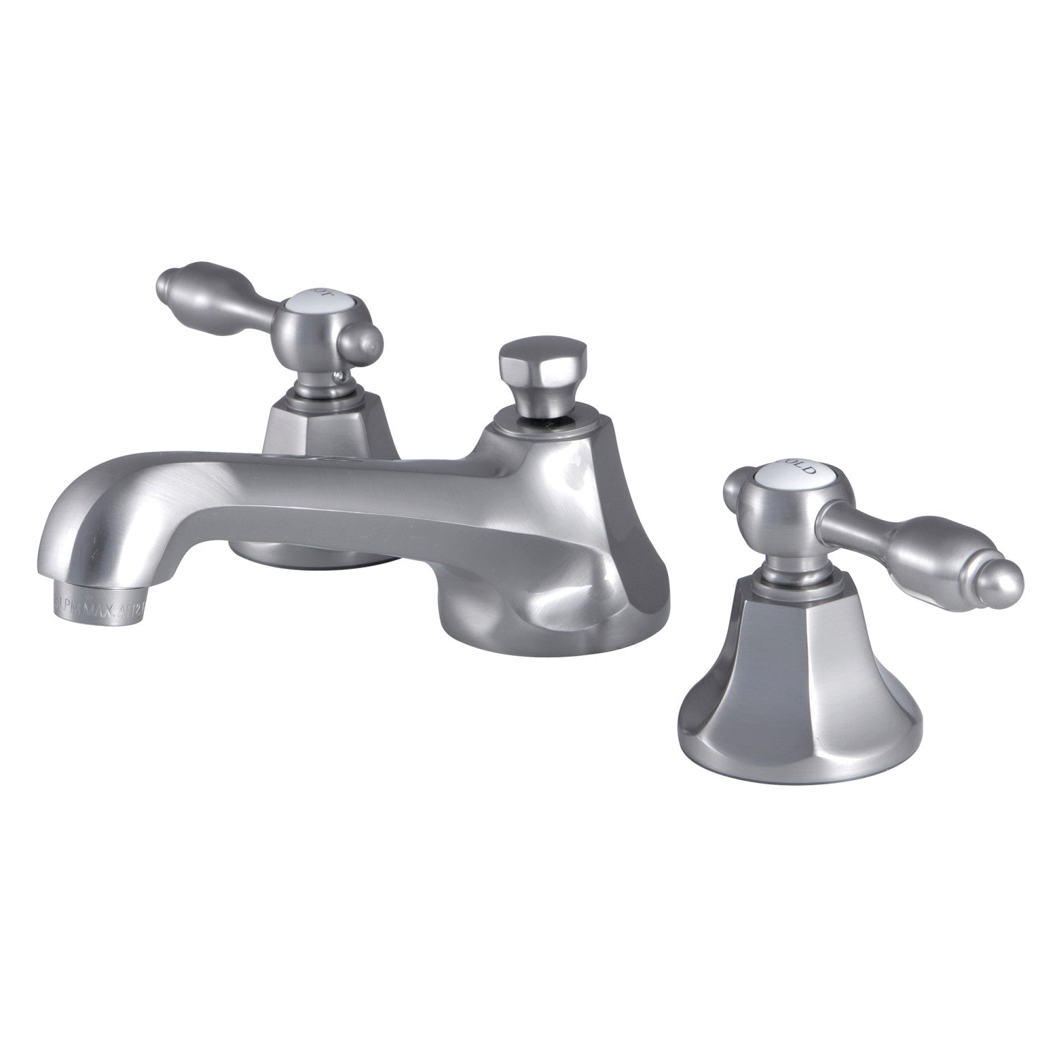 Offering a nod toward the past, this faucet is beautifully inspired by the vintage elegance of mid-19th Century design. Ideal for more spacious bathrooms, widespread faucets are more spread apart and feature a 3-hole installation. The Tudor 8-inch widespread bathroom faucet with brass pop-up and its featured sturdy brass construction and premium brushed nickel finish are guaranteed to glamorize your home's modern ensemble for years to come. A unique and classically enchanting personality is embodied in this centerpiece. A matching finish drain is also included.