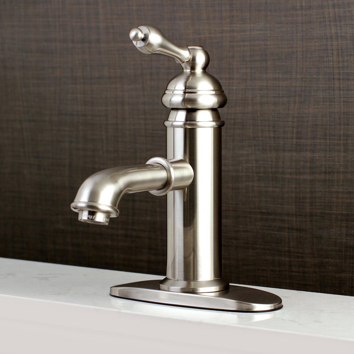 This faucet is perfect for those seeking inspiration from the exquisite artistry and architecture of the traditional Victorian era. Single-hole bathroom faucets provide a more streamlined look. Also, they will allow your bathroom to appear more spacious with the limited counter space they require. The American Classic single-handle bathroom faucet with brass pop-up and deck plate and its featured sturdy brass construction and premium brushed nickel finish are guaranteed to glamorize your home's traditional ensemble for years to come. This faucet will surely personify any homeowner's refined tastes with its regal qualities. A matching finish drain is also included.
