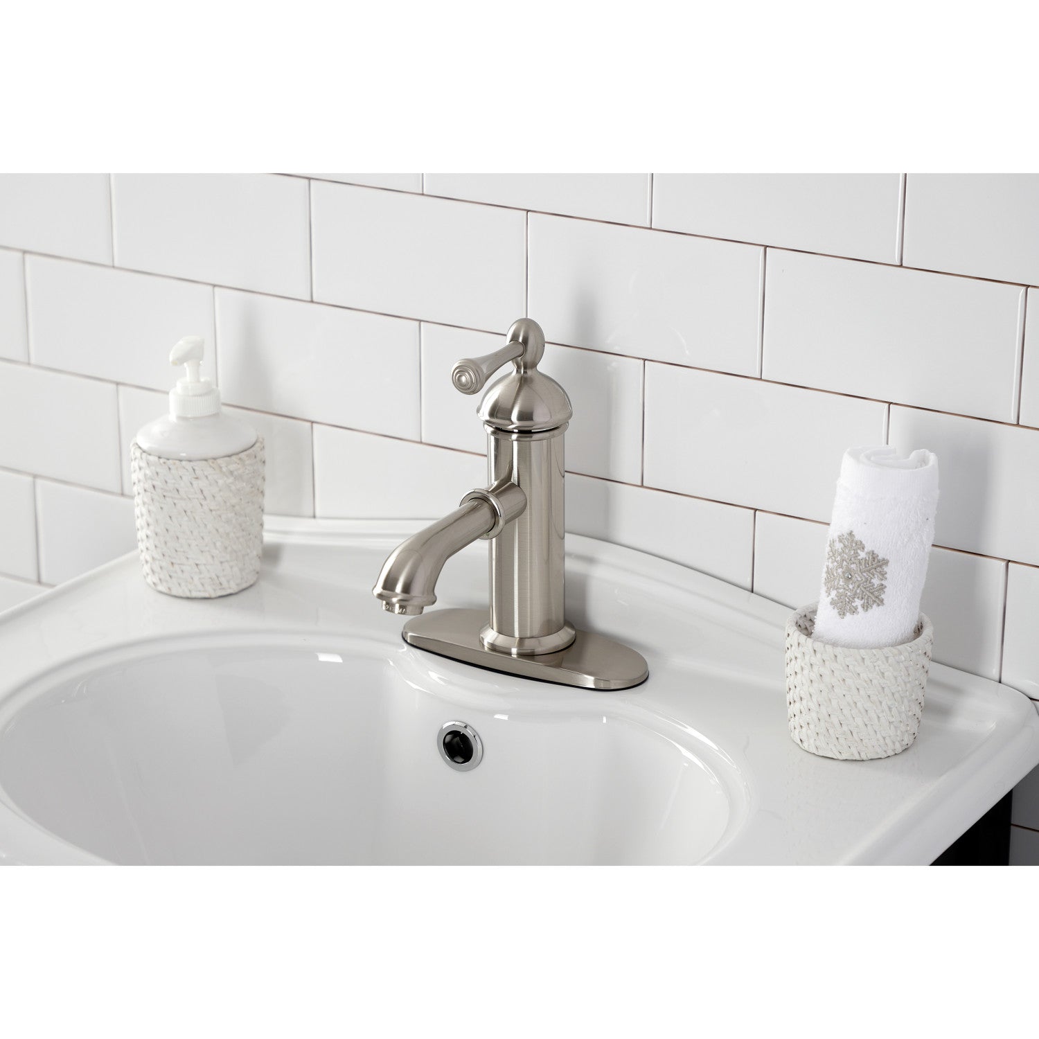 Crafted to bring aesthetic beauty alongside exceptional performance, the feature of porcelain lever handles and rounded architecture solidifies pristine refinement in this faucet. Single-hole bathroom faucets provide a more streamlined look. Also, they will allow your bathroom to appear more spacious with the limited counter space they require. The Paris single-handle bathroom faucet with brass pop-up and deck plate and its featured sturdy brass construction and premium brushed nickel finish are guaranteed to glamorize your home's traditional ensemble for years to come. Embolden your home ensemble with the addition of this exquisite fixture. A matching finish drain is also included.
