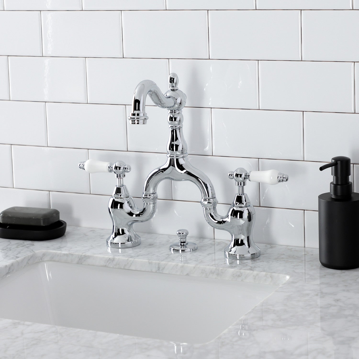 Embody the extravagance of 18th century Europe by adorning your house with the traditional elegance offered by this faucet. Elegantly designed, the exquisite arch connecting the spout to the handles provides an added aesthetic appeal to make for more of a statement piece. Additionally, the 8-1/16 inch of spout clearance make for a very easy hand washing experience with plenty of room for other tasks. The English Country bridge bathroom faucet and its featured sturdy brass construction and premium polished chrome finish are guaranteed to glamorize your home's traditional ensemble for years to come. A matching finish drain is also included.