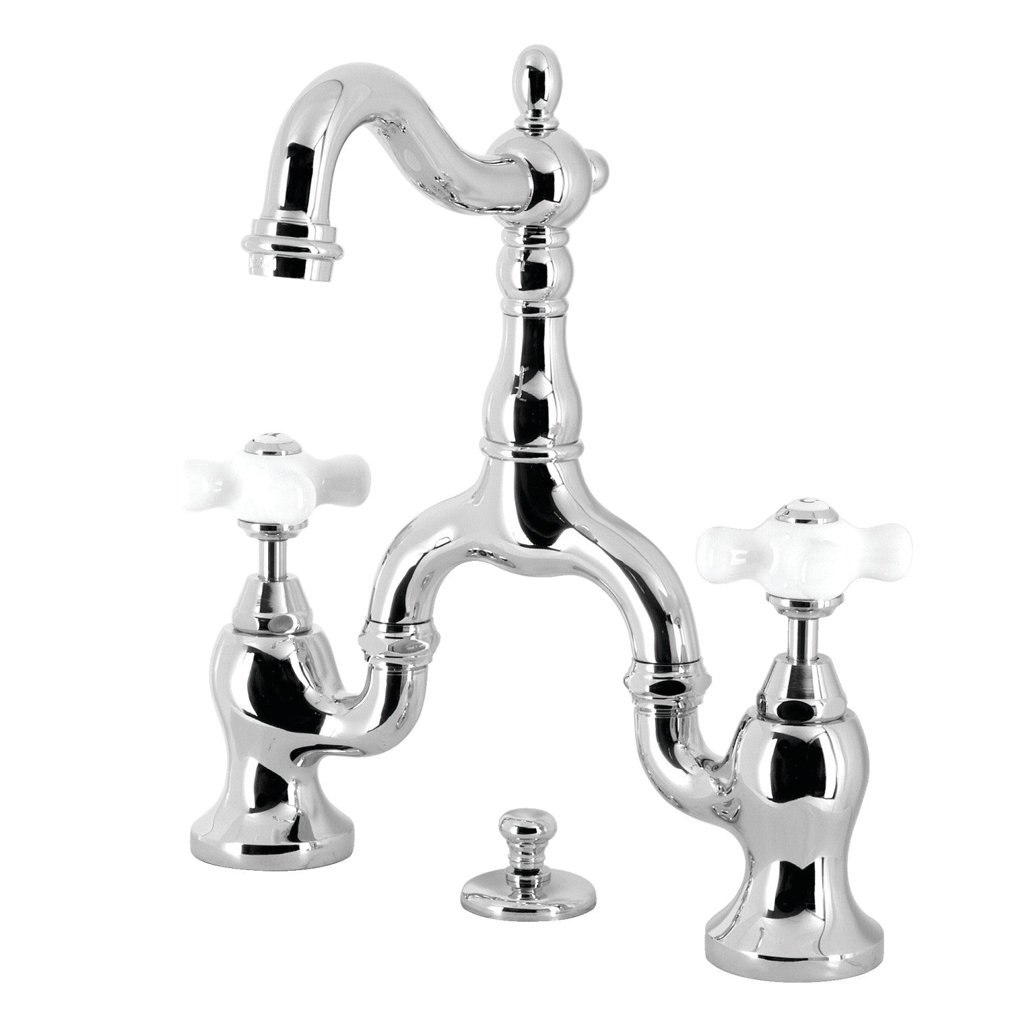 Embody the extravagance of 18th century Europe by adorning your house with the traditional elegance offered by this faucet. Elegantly designed, the exquisite arch connecting the spout to the handles provides an added aesthetic appeal to make for more of a statement piece. Additionally, the 8-1/16 inch of spout clearance make for a very easy hand washing experience with plenty of room for other tasks. The English Country bridge bathroom faucet and its featured sturdy brass construction and premium polished chrome finish are guaranteed to glamorize your home's traditional ensemble for years to come. A matching finish drain is also included.