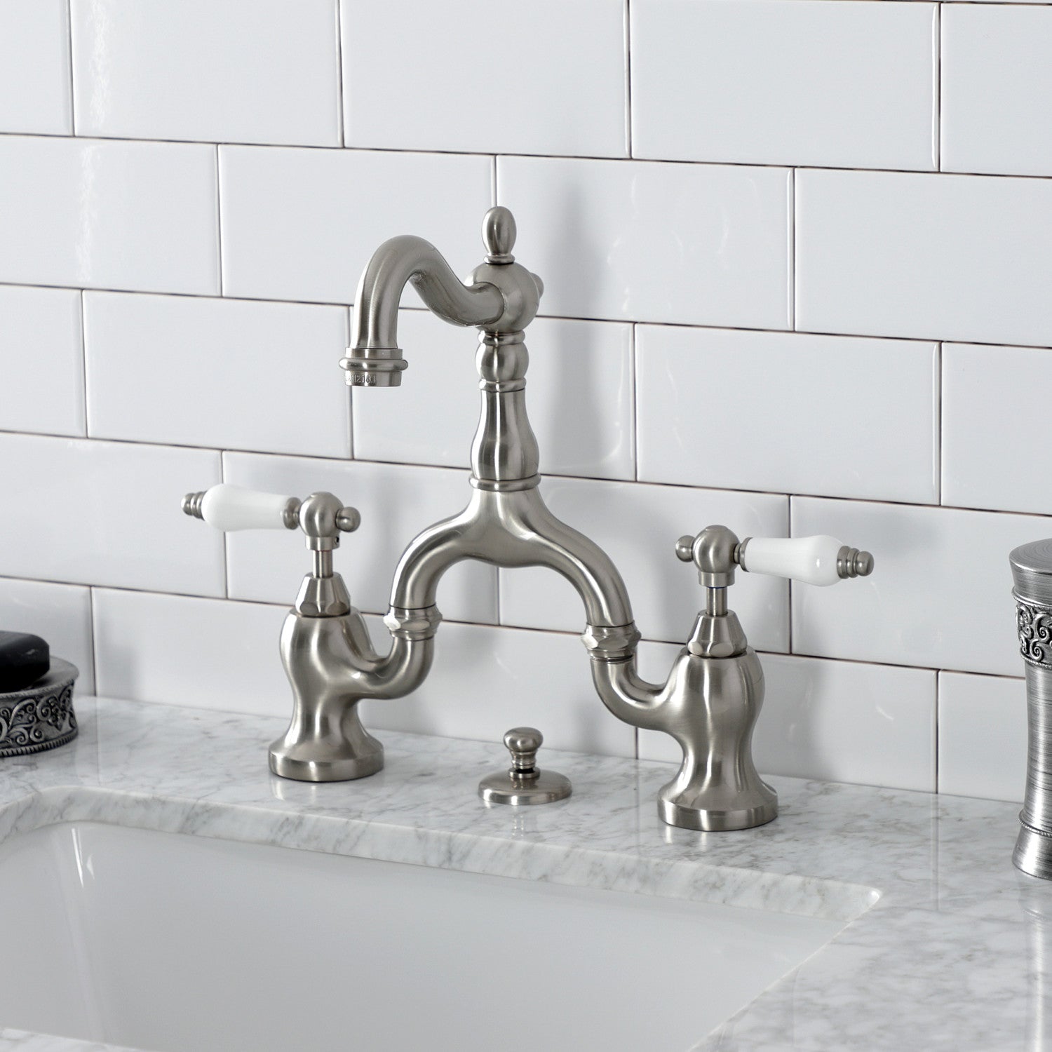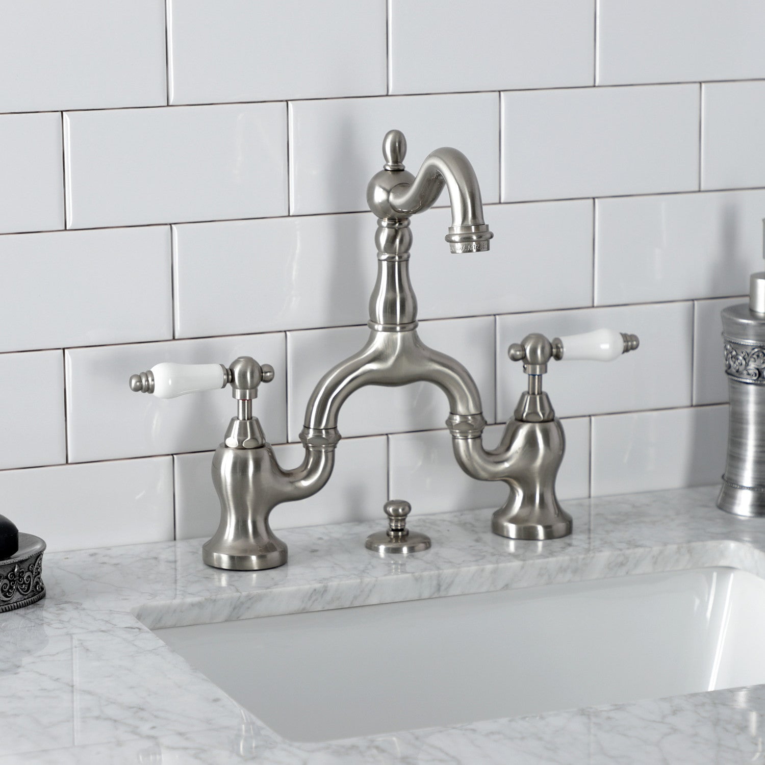 English Country KS7978PL Two-Handle 3-Hole Deck Mount Bridge Bathroom Faucet with Brass Pop-Up, Brushed Nickel