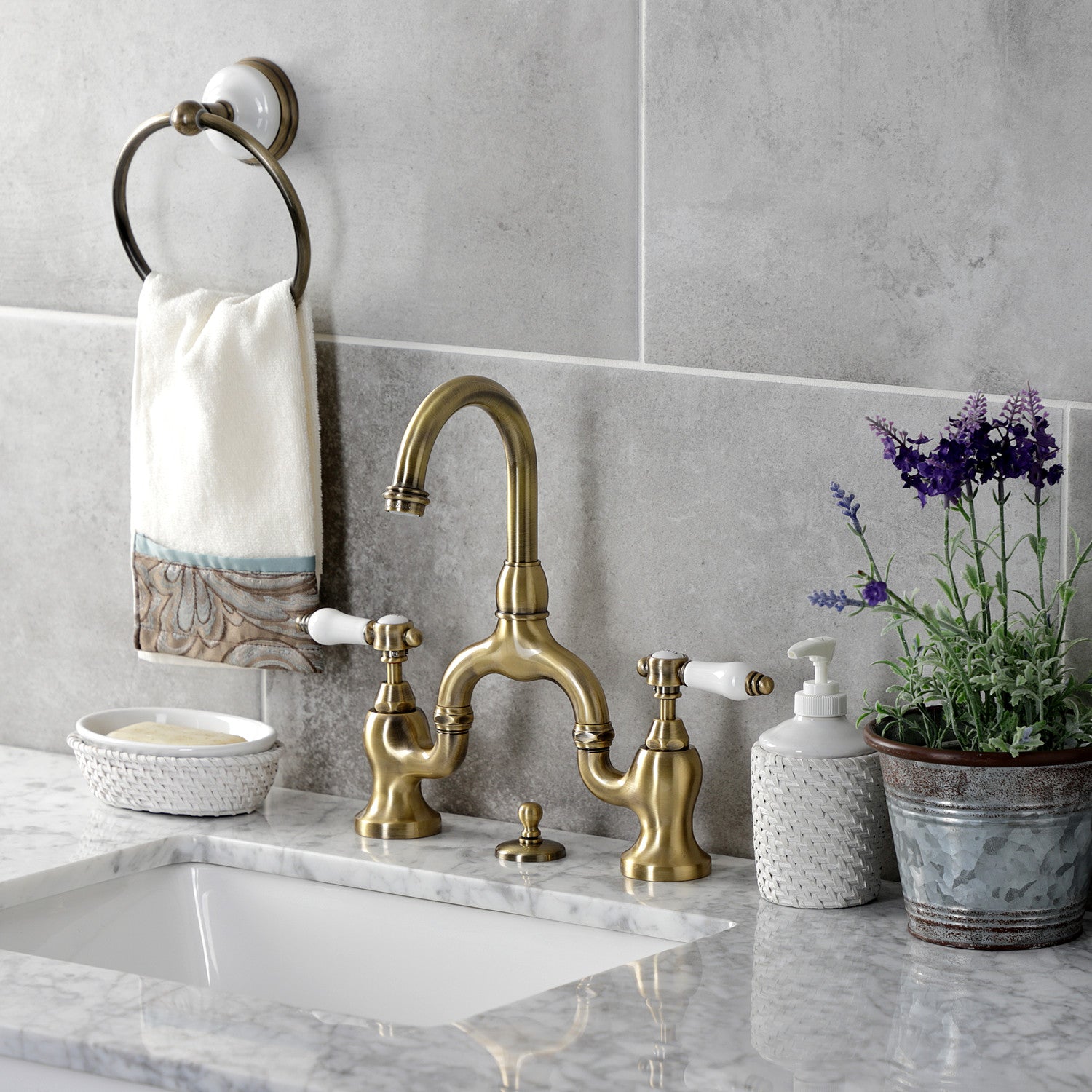The graceful elegance of timeless design is beautifully merged between British flair and Victorian delicacy within this faucet's white porcelain levers. Elegantly designed, the exquisite arch connecting the spout to the handles provides an added aesthetic appeal to make for more of a statement piece. Additionally, the 8-3/8 inch of spout clearance make for a very easy hand washing experience with plenty of room for other tasks. The Bel-Air bridge bathroom faucet and its featured sturdy brass construction and premium antique brass finish are guaranteed to glamorize your home's traditional ensemble for years to come. Varnish your bathroom with this state-of-the-art fixture. A matching finish drain is also included.