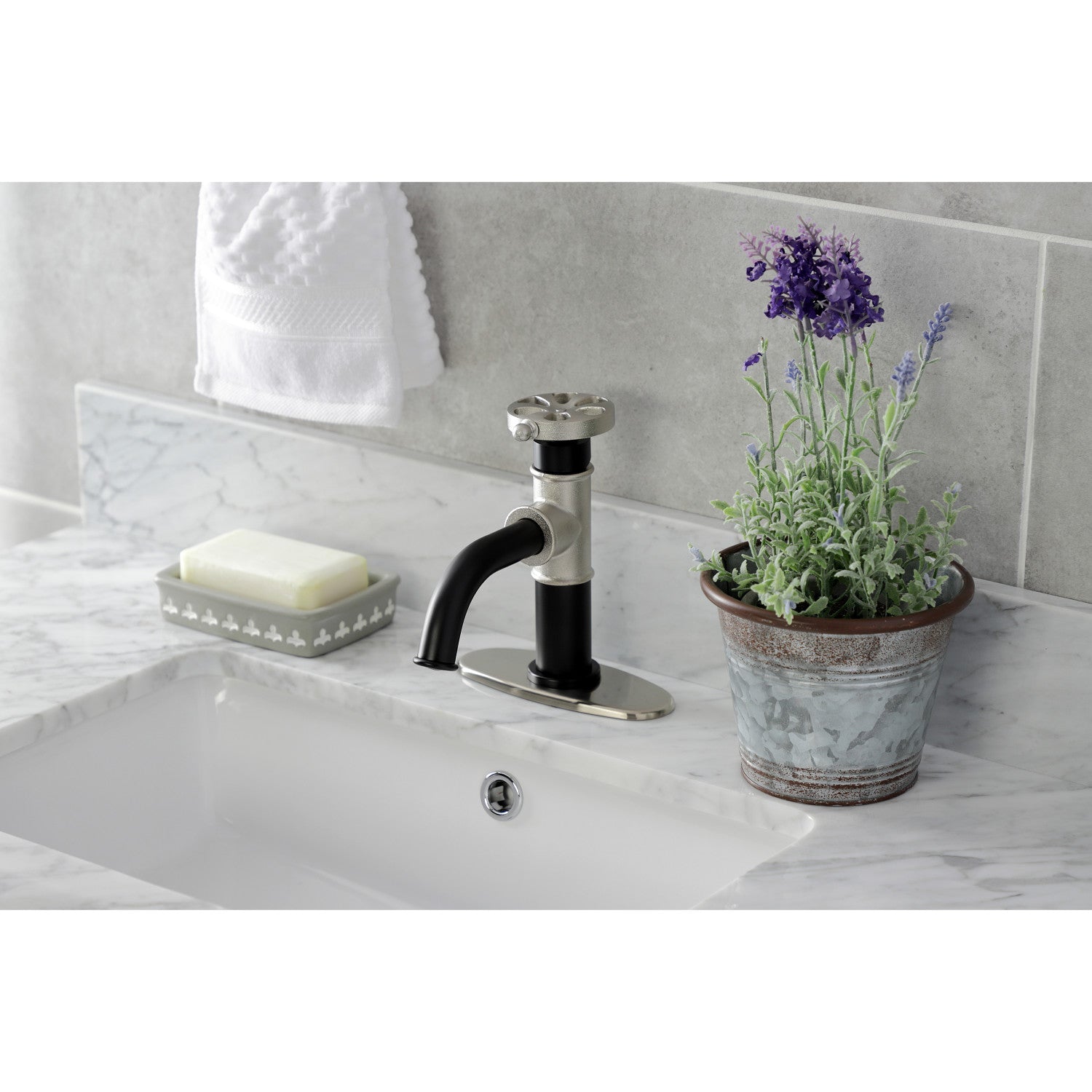 Belknap KSD2828RX Single-Handle 1-Hole Deck Mount Bathroom Faucet with Push Pop-Up and Deck Plate, Matte Black/Brushed Nickel