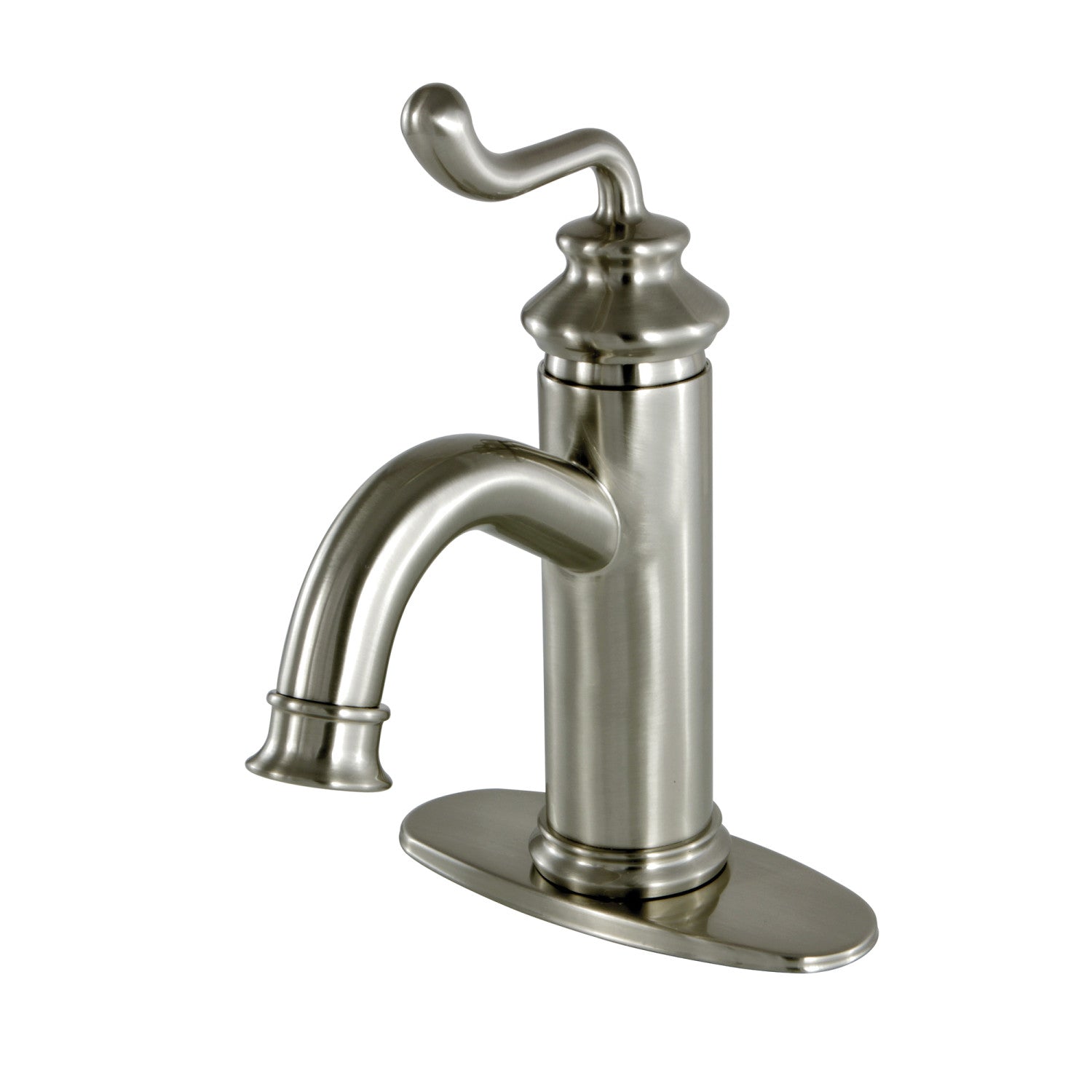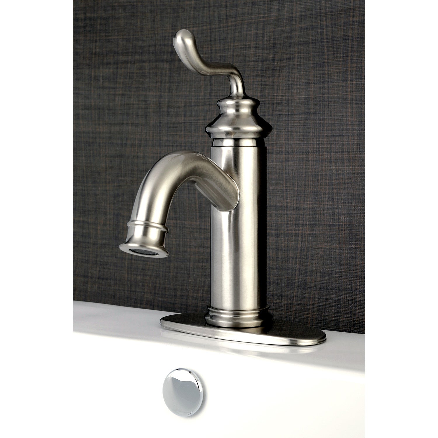 Mimic the stunning stylings of European households in your own home with this faucet's nod towards traditionalism. Single-hole bathroom faucets provide a more streamlined look. Also, they will allow your bathroom to appear more spacious with the limited counter space they require. The Royale single-handle monoblock bathroom faucet and its featured sturdy brass construction and premium brushed nickel finish are guaranteed to glamorize your home's traditional ensemble for years to come. By immersing your home with this faucet, anyone may feel like nobility. A matching finish drain is also included.