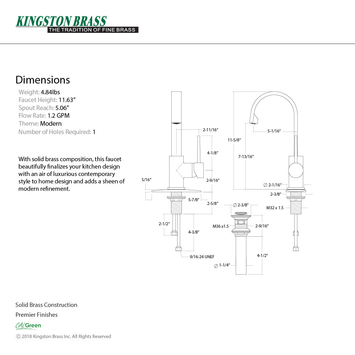 - 1.2 GPM/4.5 LPM spout flow rate at 60 PSI