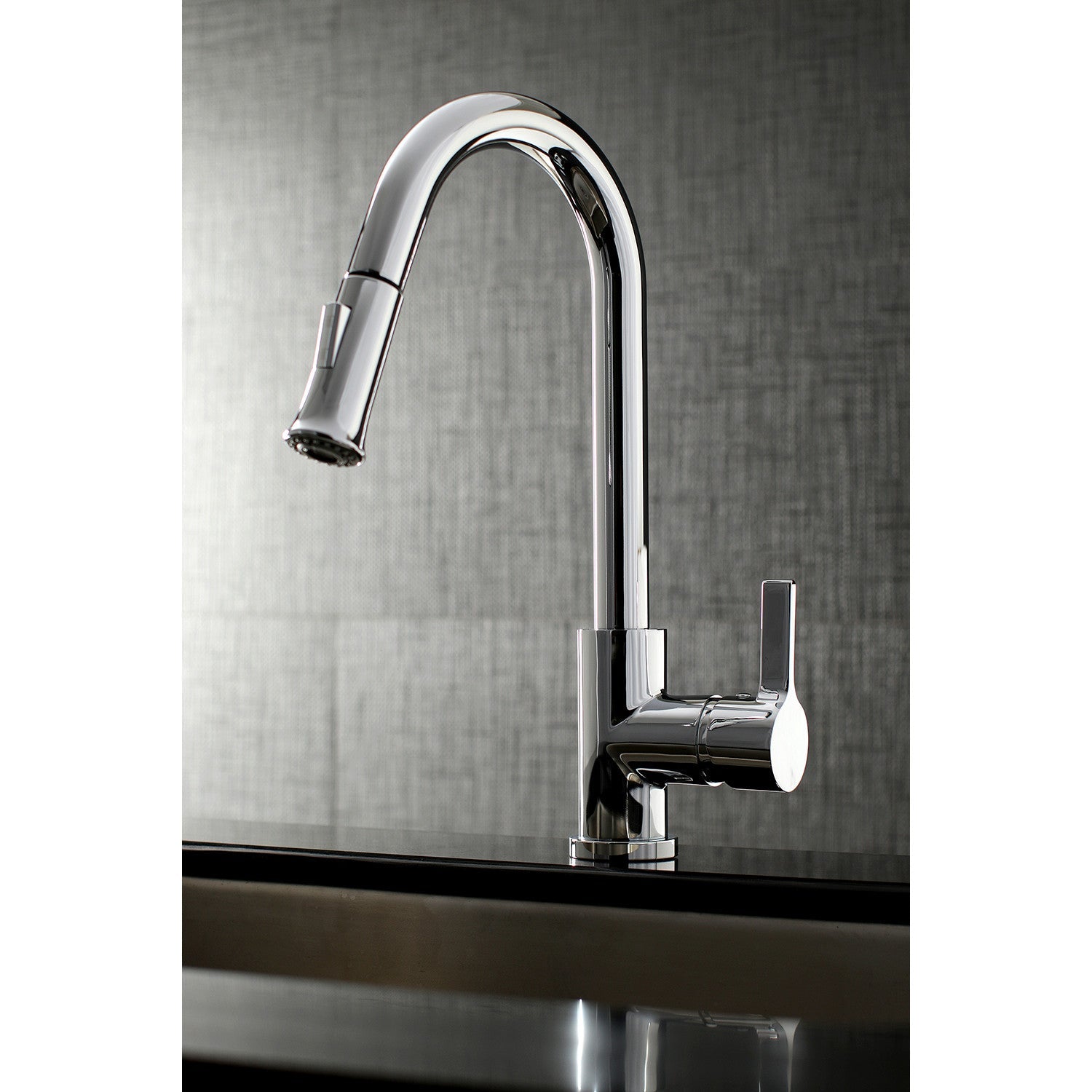 Transcend your home into a futuristic utopia with this faucet's brilliant craftsmanship and modern, curved spout with ergonomic levers. Designed for optimum versatility and functionality, modern day technology is provided for a state-of-the-art product. The Continental Pull-Down Kitchen Faucet features a high arching spout to easily clean larger dishes, swivel ability to reach any area in and around your sink, and a dual function pull-down sprayer to tackle tough messes. Matching accessories are available for use.