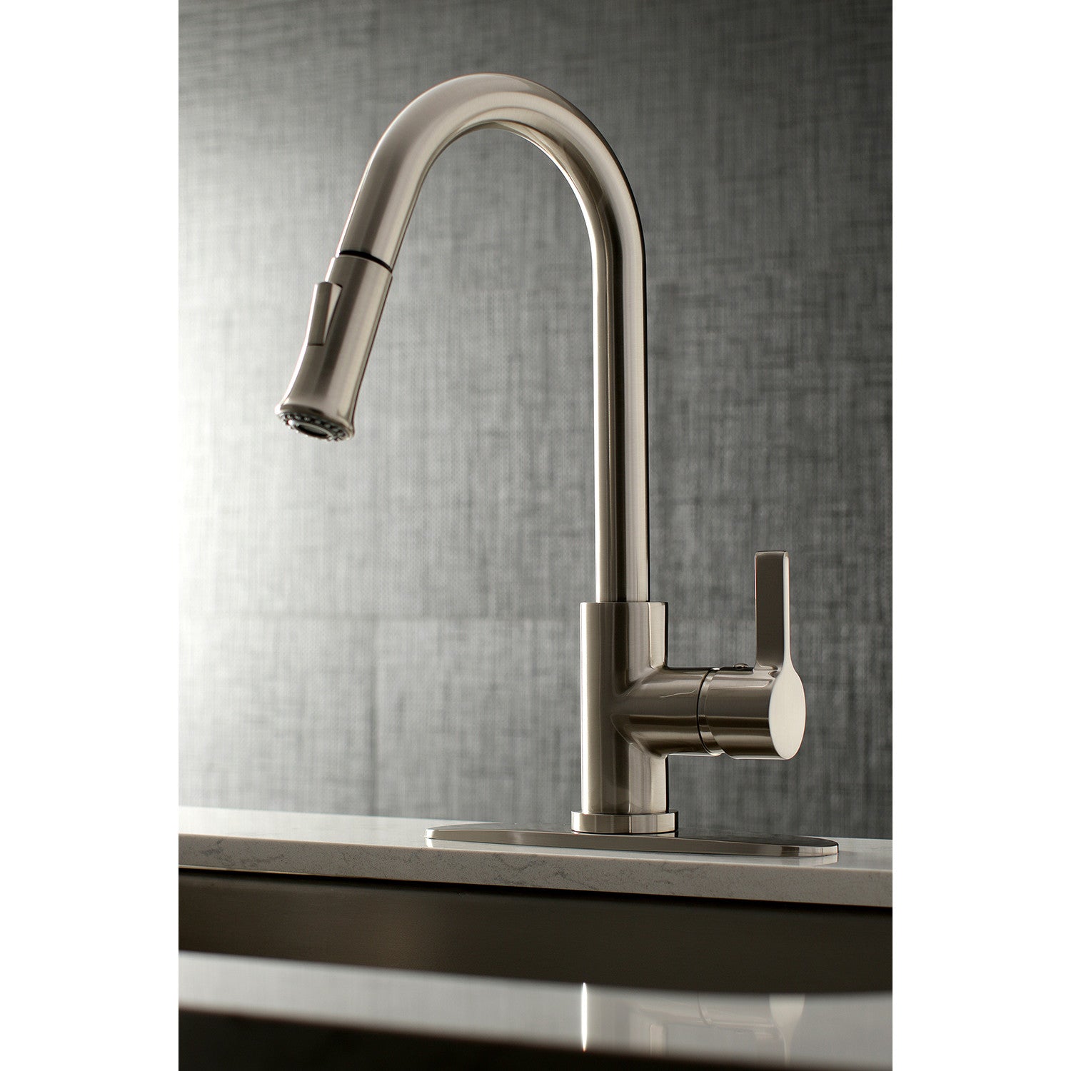 Transcend your home into a futuristic utopia with this faucet's brilliant craftsmanship and modern, curved spout with ergonomic levers. Designed for optimum versatility and functionality, modern day technology is provided for a state-of-the-art product. The Continental Pull-Down Kitchen Faucet features a high arching spout to easily clean larger dishes, swivel ability to reach any area in and around your sink, and a dual function pull-down sprayer to tackle tough messes. Matching accessories are available for use.