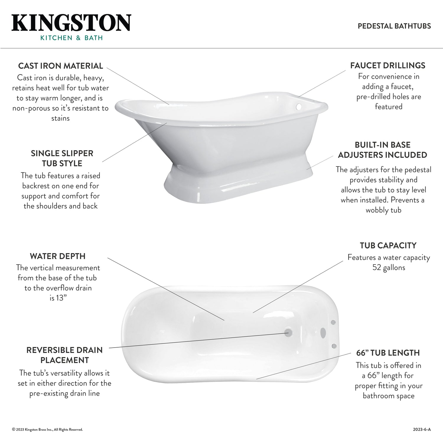 Incorporate the regal beauty of a Kingston Brass pedestal tub for years and years of luxury baths suitable for royalty. Pedestal tubs are generally categorized as the contemporary descendant of the classic clawfoot tub. However, unlike the clawfoot tub, pedestal tubs rely on a solid base ring bordering the bottom perimeter to support and raise it off the floor, giving it a one-of-a-kind personality. The Aqua Eden 66 in. cast iron pedestal tub with 7 in. faucet drillings will wholly beautify your home for years to come thanks to its durable and heavy cast iron construction. This bathtub is enameled in glossy white for a classic look, exceptional durability, and easy care and maintenance for years to come.