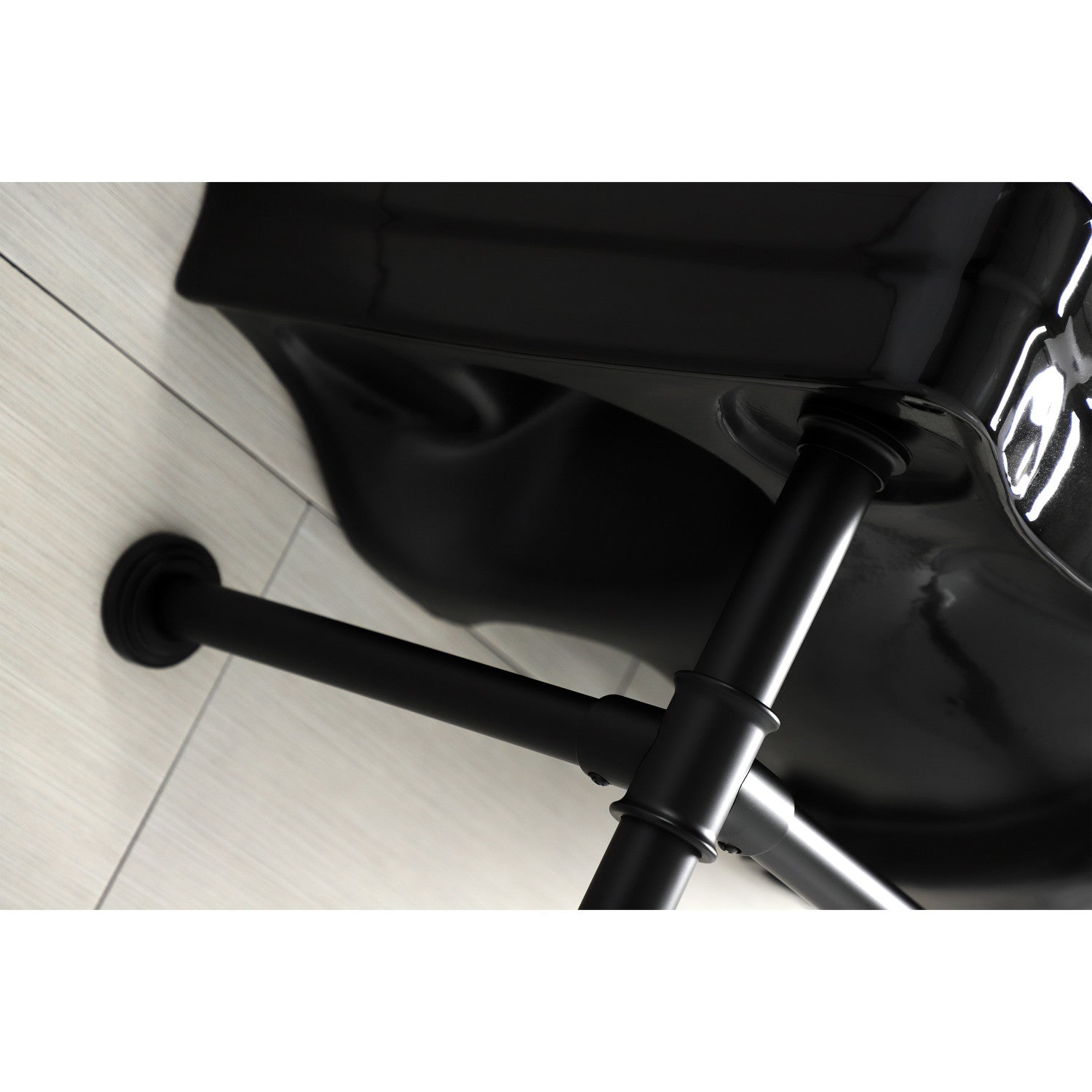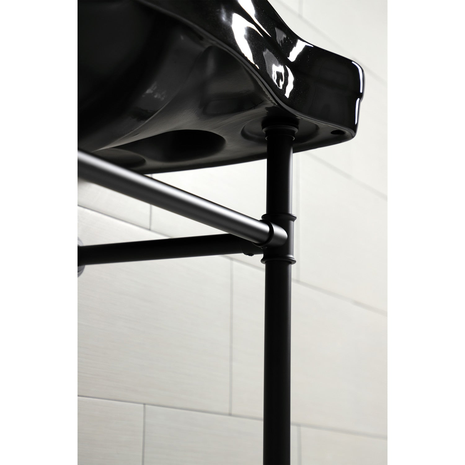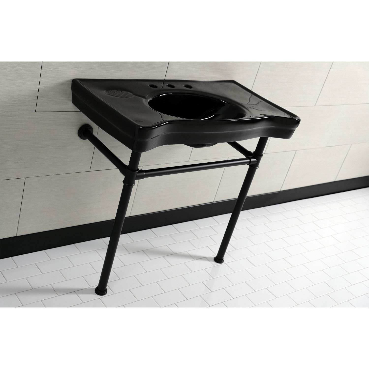 From Kingston Brass, this basin console with pedestal was designed with a striking design that will make almost any interior stand out. Constructed from solid ceramic, appreciate the finished glow that the console gives off. Installation of the console is on two legs and is mounted on the wall of the interior room. The console comes with a generous bowl size, while the overall console dimensions are (L)35-13/16" x (W)19-1/8" x (H)33-7/8" and is included with pre-drilled holes perfect for a 3-hole faucet install. The console's smooth texture allows for easy-to-clean and easy-to-manage maintenance. The console is also finished with a sleek black/matte black color that brings out the texture and the design of the ceramic material.