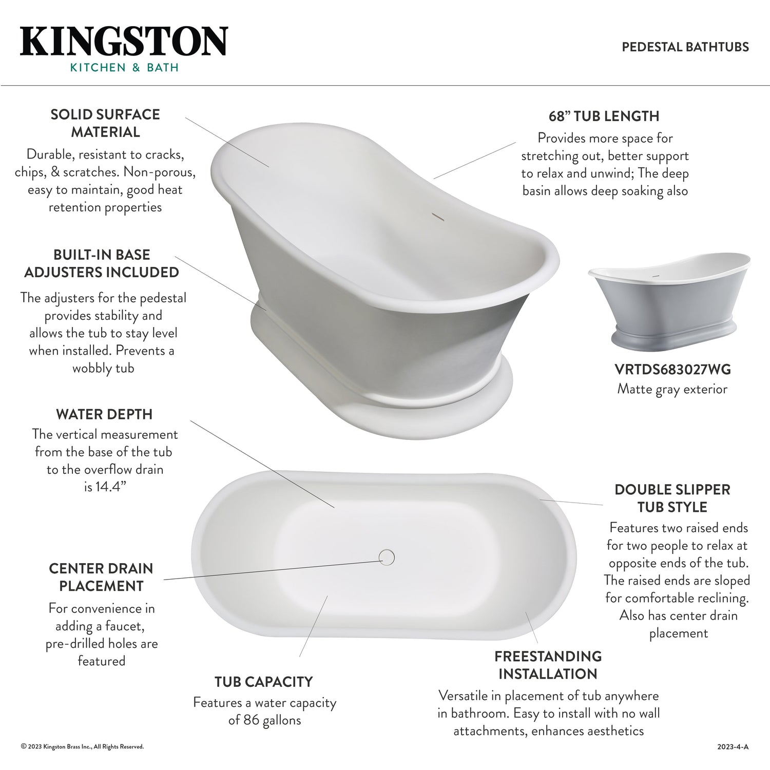 Elevate your home's contemporary decorum, while you effortlessly recline in the cozy embrace of a Kingston Brass freestanding bathtub. Highly acclaimed for its clean and contemporary yet minimalist shape, this tub will be made the focal point in many bathrooms. The Aqua Eden 68-inch double slipper solid surface freestanding tub with drain will wholly beautify your home for years to come thanks to its durable and scratch resistant solid surface white stone construction. This bathtub's exterior is finished in an elegant matte white to bring high design into your space, and its interior and inner rim are polished to a glossy finish to make cleaning and care easier.