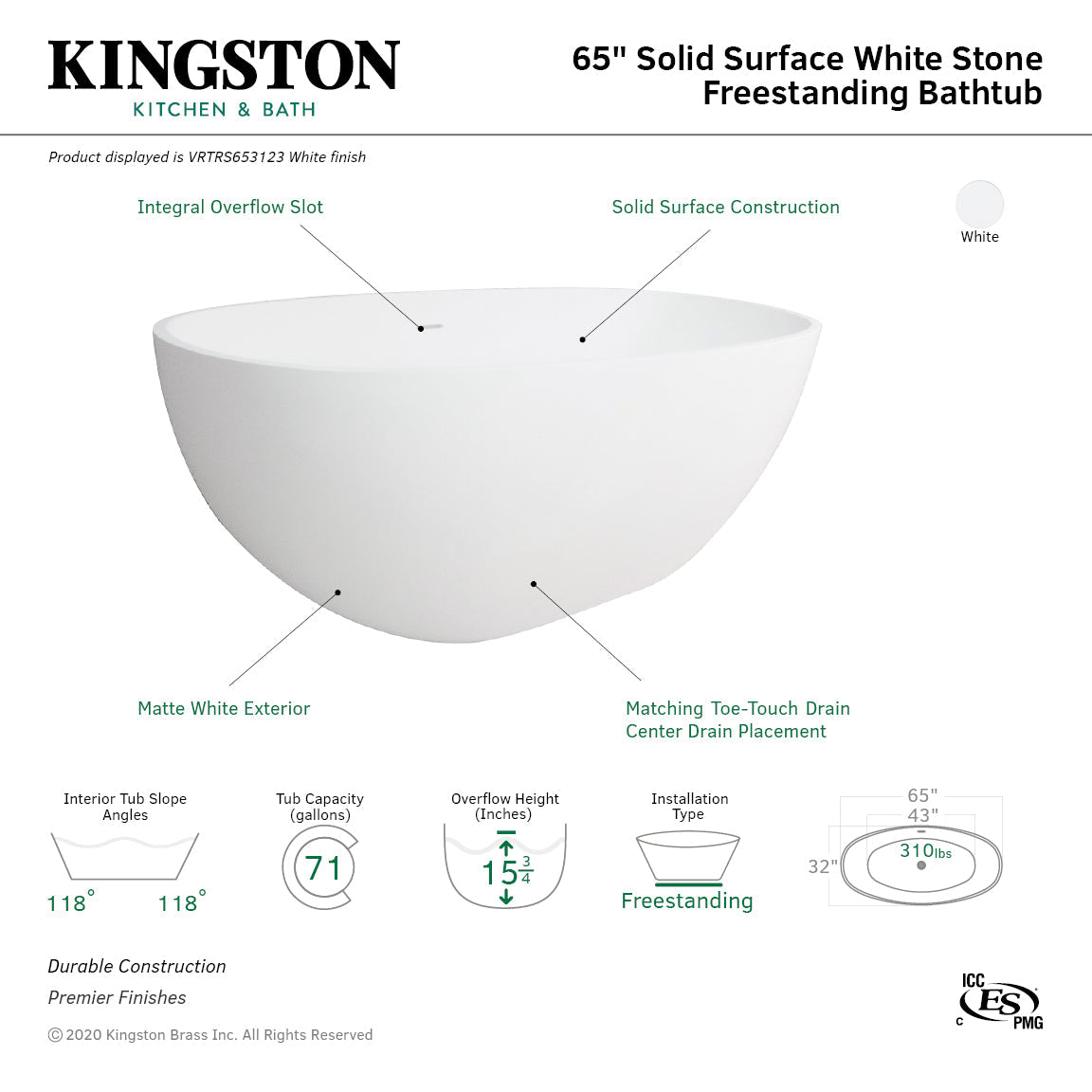 Arcticstone VRTRS653123 65-Inch Solid Surface White Stone Freestanding Tub with Drain, Matte White