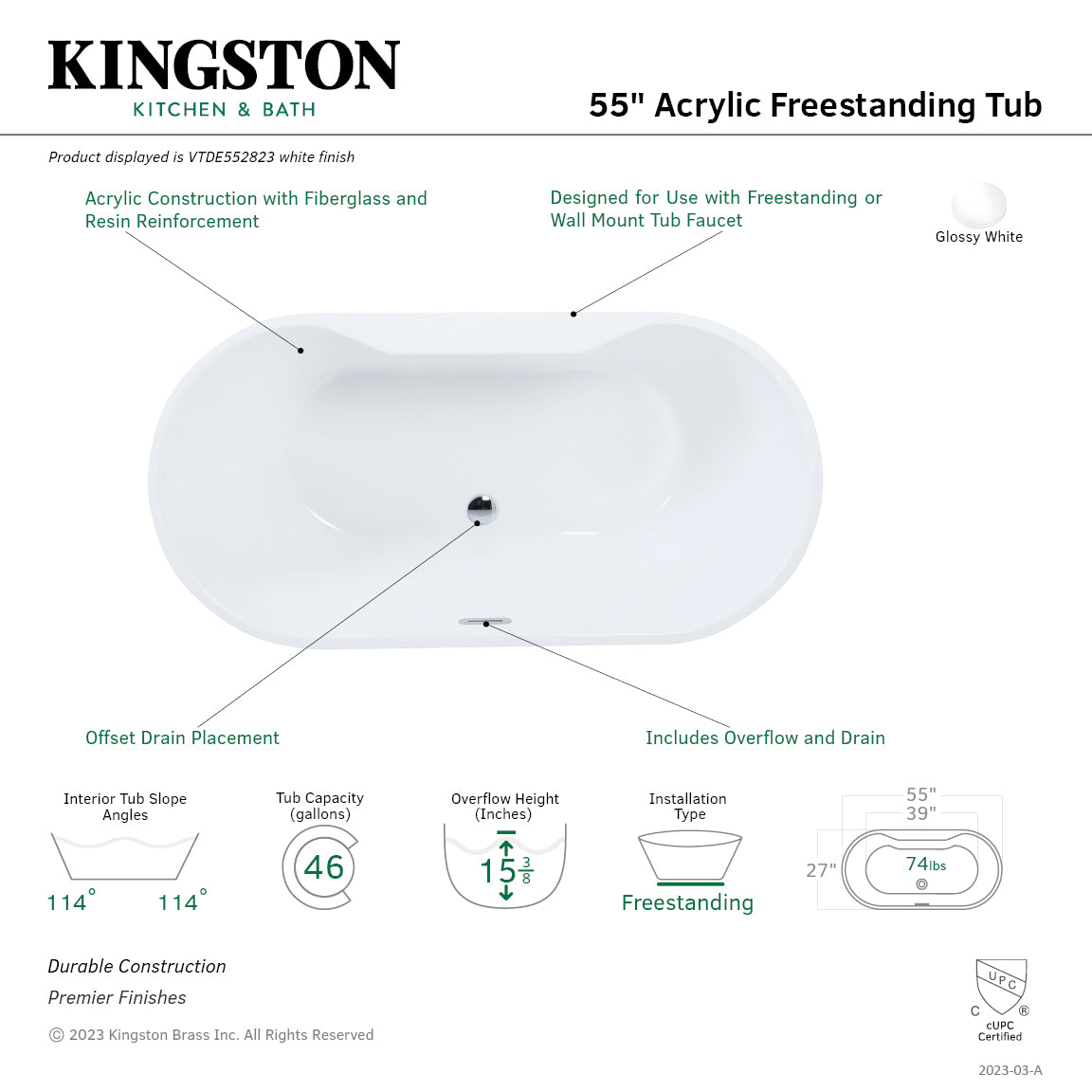 Elevate your home's contemporary decorum, while you effortlessly recline in the cozy embrace of a Kingston Brass freestanding bathtub. Highly acclaimed for its clean and contemporary yet minimalist shape, this tub will be made the focal point in many bathrooms. The 55-inch acrylic freestanding tub with drain will wholly beautify your home for years to come thanks to its durable and easily repairable acrylic construction. This bathtub is finished inside and out in a brilliant, high-gloss white that ensures crisp aesthetics and easy care now and well in the future.