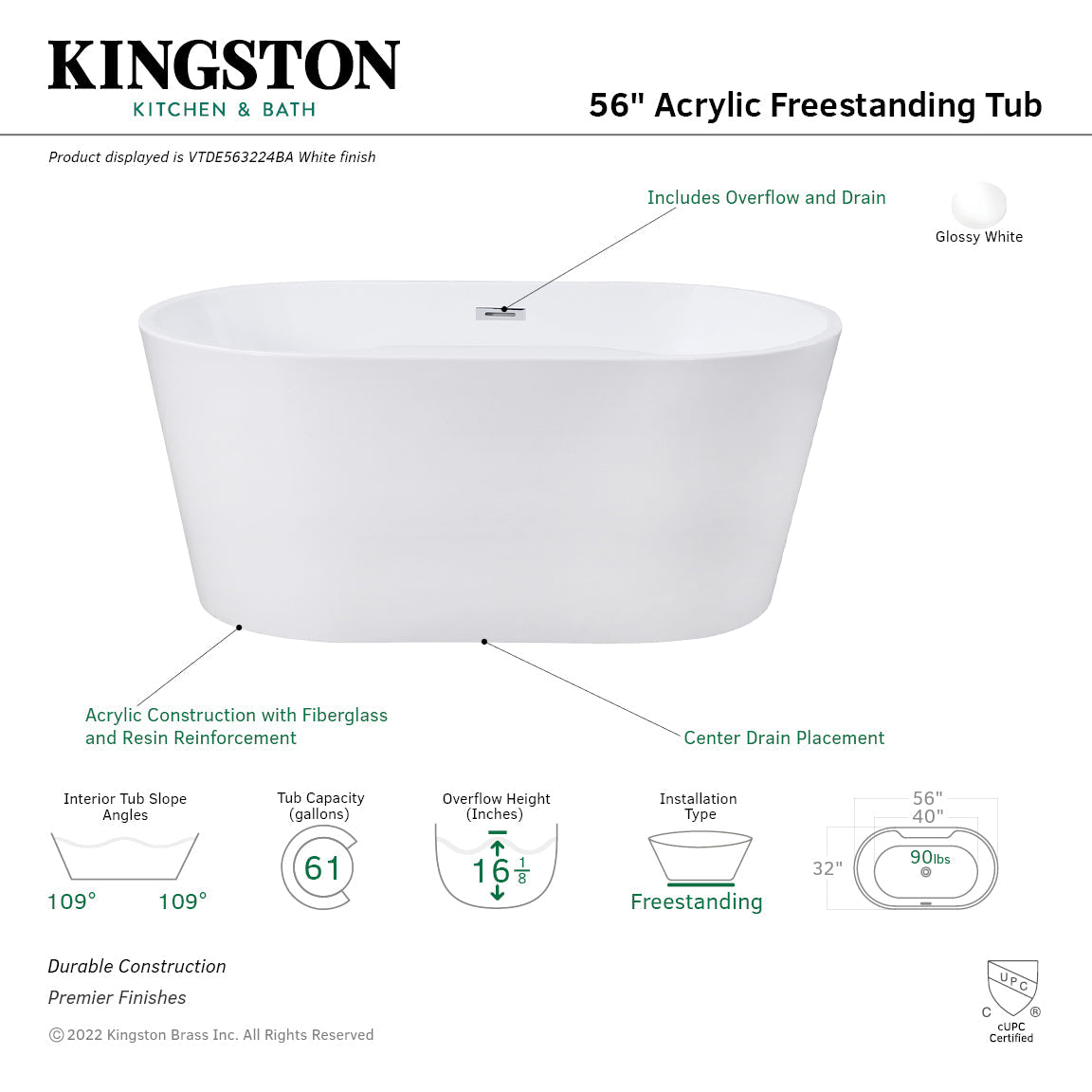Aqua Eden VTDE563224BA 56-Inch Acrylic Freestanding Tub with Drain, Glossy White
