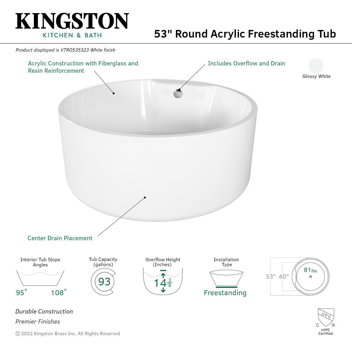 Elevate your home's contemporary decorum, while you effortlessly recline in the cozy embrace of a Kingston Brass freestanding bathtub. Highly acclaimed for its clean and contemporary yet minimalist shape, this tub will be made the focal point in many bathrooms. The Aqua Eden 53-inch round acrylic freestanding tub will wholly beautify your home for years to come thanks to its durable and easily repairable acrylic construction. Tub drain is included. This bathtub is finished inside and out in a brilliant, high-gloss white that ensures crisp aesthetics and easy care now and well in the future.