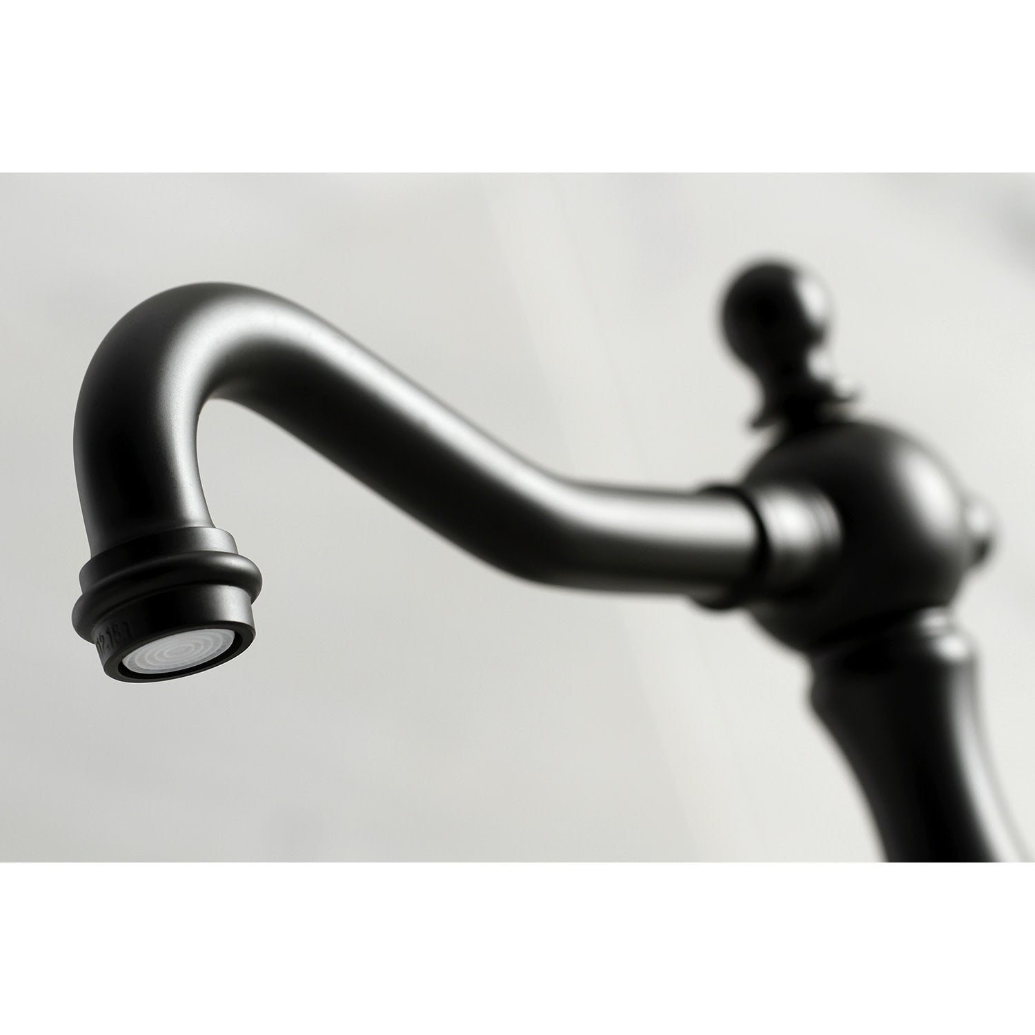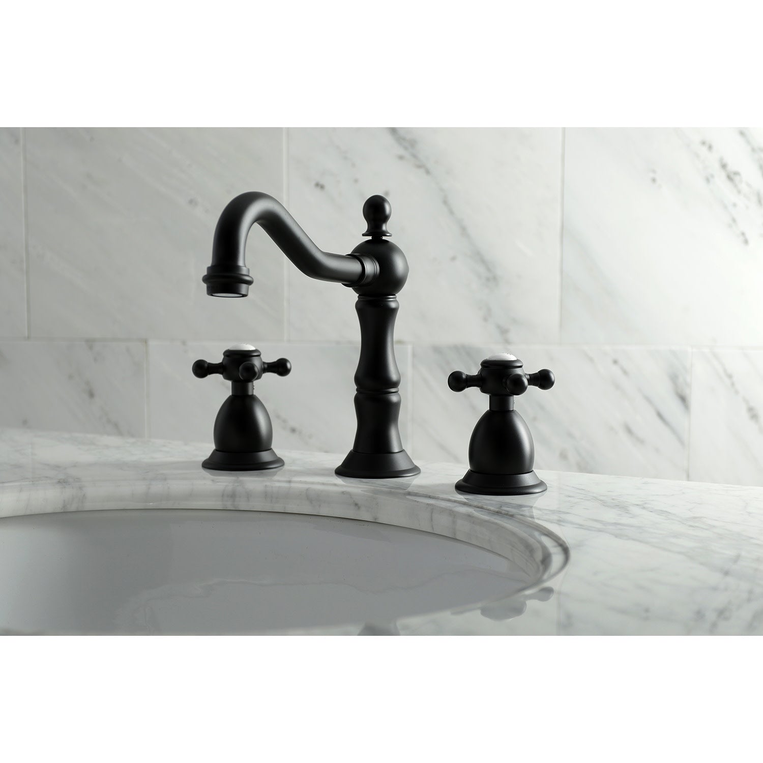 A lavish spark of traditionally stylized glamour is brought to your bathroom ensemble with this beautiful faucet. Ideal for more spacious bathrooms, widespread faucets are more spread apart and feature a 3-hole installation. The Heritage widespread bathroom faucet and its featured sturdy brass construction and premium matte black finish are guaranteed to glamorize your home's traditional ensemble for years to come. Celebrate sophistication and traditional decor with this statement piece. A matching finish drain is also included.