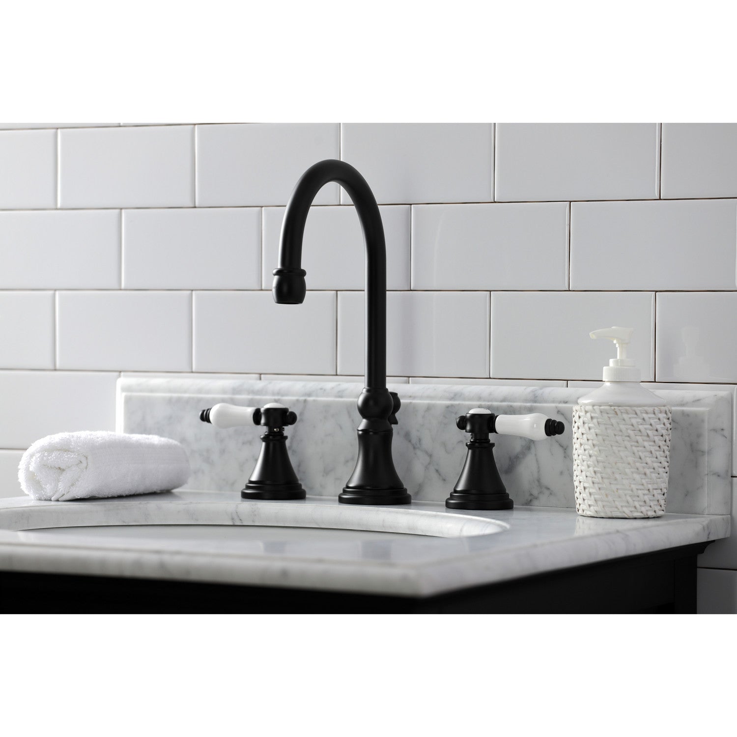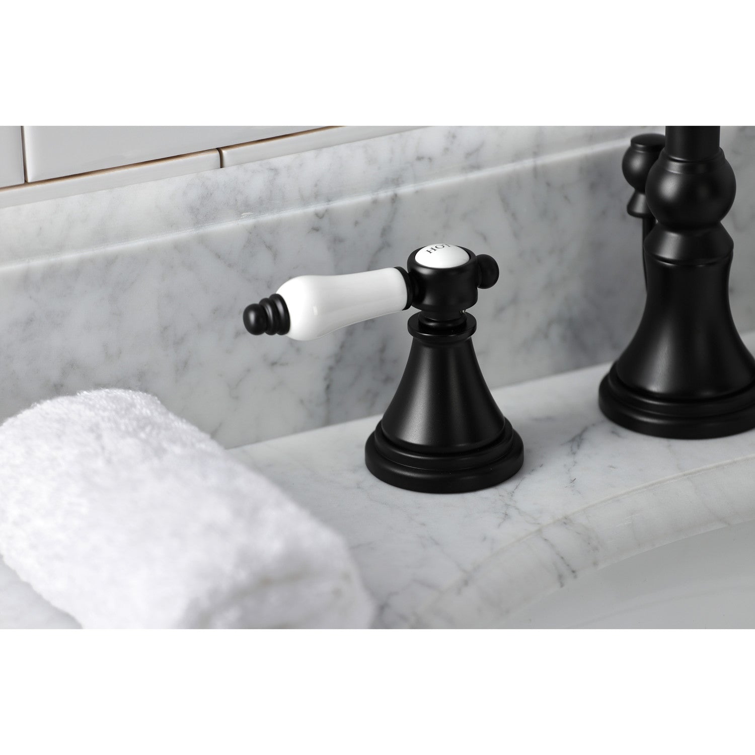 The graceful elegance of timeless design is beautifully merged between British flair and Victorian delicacy within this faucet's white porcelain levers. Ideal for more spacious bathrooms, widespread faucets are more spread apart and feature a 3-hole installation. The Bel-Air widespread bathroom faucet with brass pop-up and its featured sturdy brass construction and premium matte black finish are guaranteed to glamorize your home's traditional ensemble for years to come. Varnish your bathroom with this state-of-the-art fixture. A matching finish drain is also included.