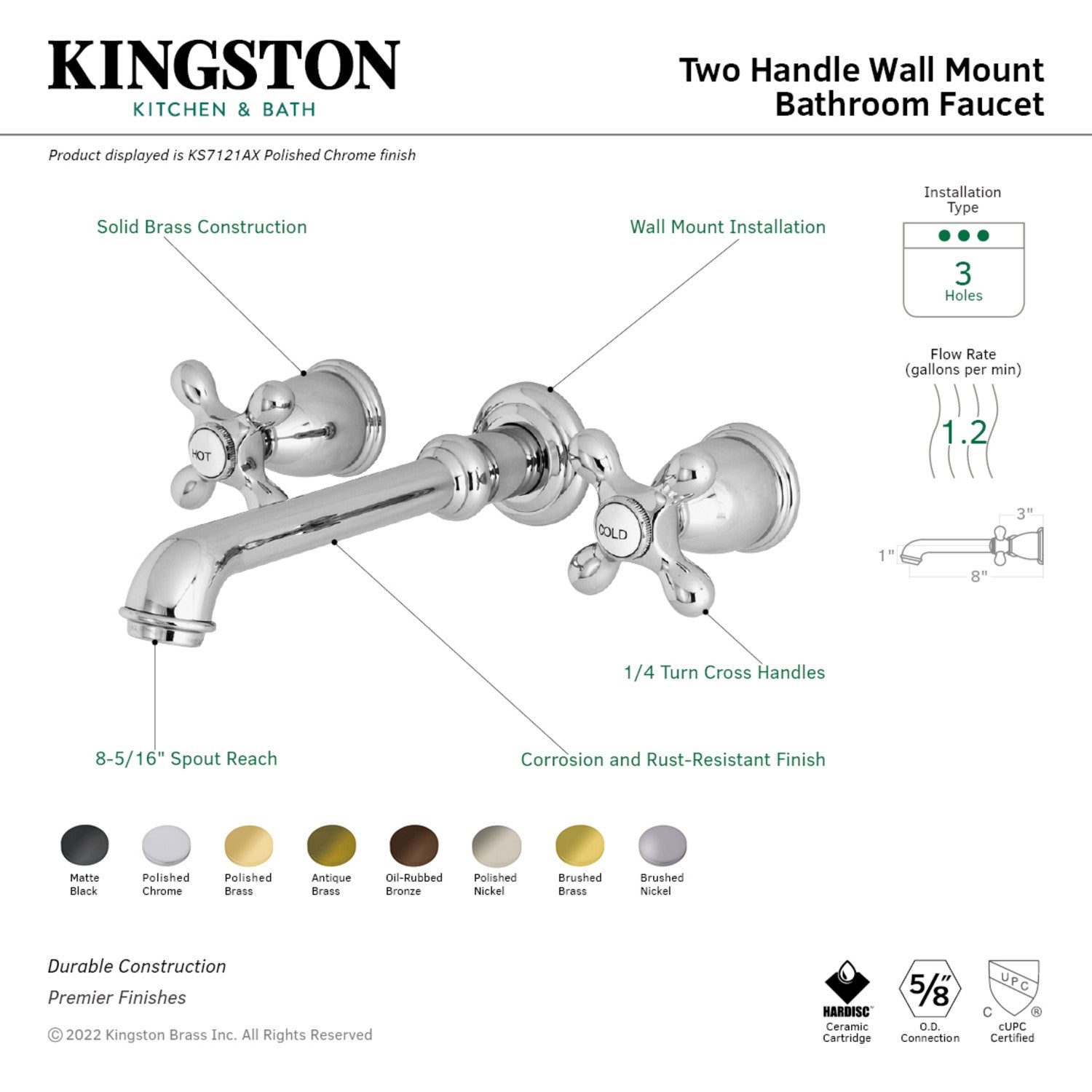 Kingston Brass KS7120AX English Country Two-Handle Wall Mount Bathroom Faucet, Matte Black