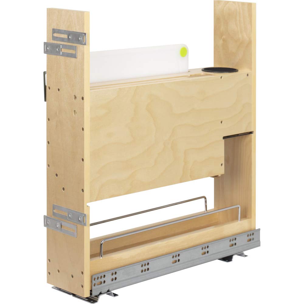 Protect your knife blades and maximize your cabinet storage, all while clearing your counters, with our clever 5" knife pullout featuring premium soft-close undermount slides and patented "No Wiggle" top-mounting bracket with heavy-duty slide. Eliminates side-to-side movement and sag commonly seen in other pullouts. The double-sided magnetic bar has 31.5" of storage space and can accommodate blades up to 9" with a 6" handle. Rear plastic insert holds additional steak knives. Ships fully assembled with a magnetic bar, knife insert, and plastic cutting board, and open bottom shelf for additional storage. Everything a home chef needs to efficiently meal prep! Slides are pre-installed for quick and easy installation.