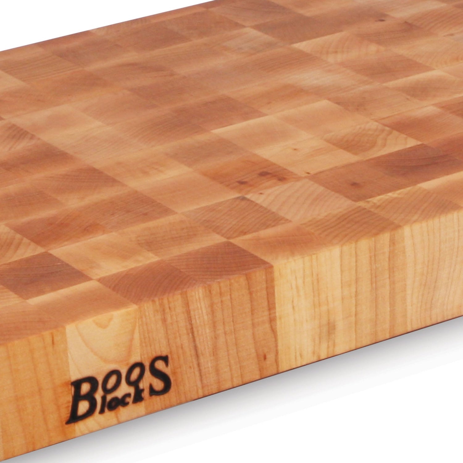 Bring home a culinary classic from the Classic Reversible End Grain Chopping Block collection by John Boos. The Classic collection features butcher blocks made with beautiful end grain construction, resulting in the iconic checkerboard wood pattern. Classic Reversible blocks are available in thicknesses ranging from 2.25-6 inches. True to their roots, Classic Collection Chopping Blocks are ideal for daily cutting, chopping and food preparation tasks. Since 1887, every genuine John Boos cutting board and butcher block has been proudly made in Effingham, Illinois by skilled craftspeople using time honored techniques. Today, USA made John Boos cutting boards and butcher blocks are used and loved in commercial and home kitchens worldwide. Generations of culinary professionals have trusted and relied on John Boos products, because Boos blocks and cutting boards are designed to meet the demanding requirements of culinary professionals who expect the highest level of quality and food safety standards. The robust and durable construction gives the work surface a commercial grade toughness that protects the sharp edge on fine cutlery. Often imitated, John Boos and Co. is internationally known for its expertise in crafting American hardwoods into products of beauty, durability and function. Simple board care can ensure this heirloom, handcrafted board is a favorite in your kitchen for years to come. Every John Boos Board and Block comes with a food safe natural oil finish that helps protect the wood during transit. Once a month, apply an even coat of John Boos Mystery Oil (NSF approved, sold separately), and allow it to soak in overnight. Repeat this process more often when the board is brand new or if you live in a dry, arid climate. John Boos recommends applying John Boos Board Cream (also sold separately) to seal the top of the wood surface after applying the Mystery Oil. A few quick minutes of regular oil application will ensure your new board is properly seasoned, and ready for work! After use, wash board with warm, soapy water (all wooden cutting boards are not dishwasher safe and should not be soaked in water).. Troubleshooting : Warpage: The board needs to be Oiled at least once a month. After oiling the customer can apply the Boos Board Cream. Warpage is caused by a imbalance of moisture in the wood, be sure to oil all sides of the cutting board. Our boards are individually manufactured and oiled before packaging at the factory. ** note: Use the John Boos Oil or Mineral oil. Boos Board cream is to be used only with the oil. Splitting Glue line: If the board has been properly oiled and maintained the glue lines should hold indefinitely. Once in a while there might be a piece of wood that did not bond and a glue line failure can occur. Compared to the number of boards sold the amount with glue line failure is very small. 20X15X2.25 MPL-END GR-REV-GRIPS