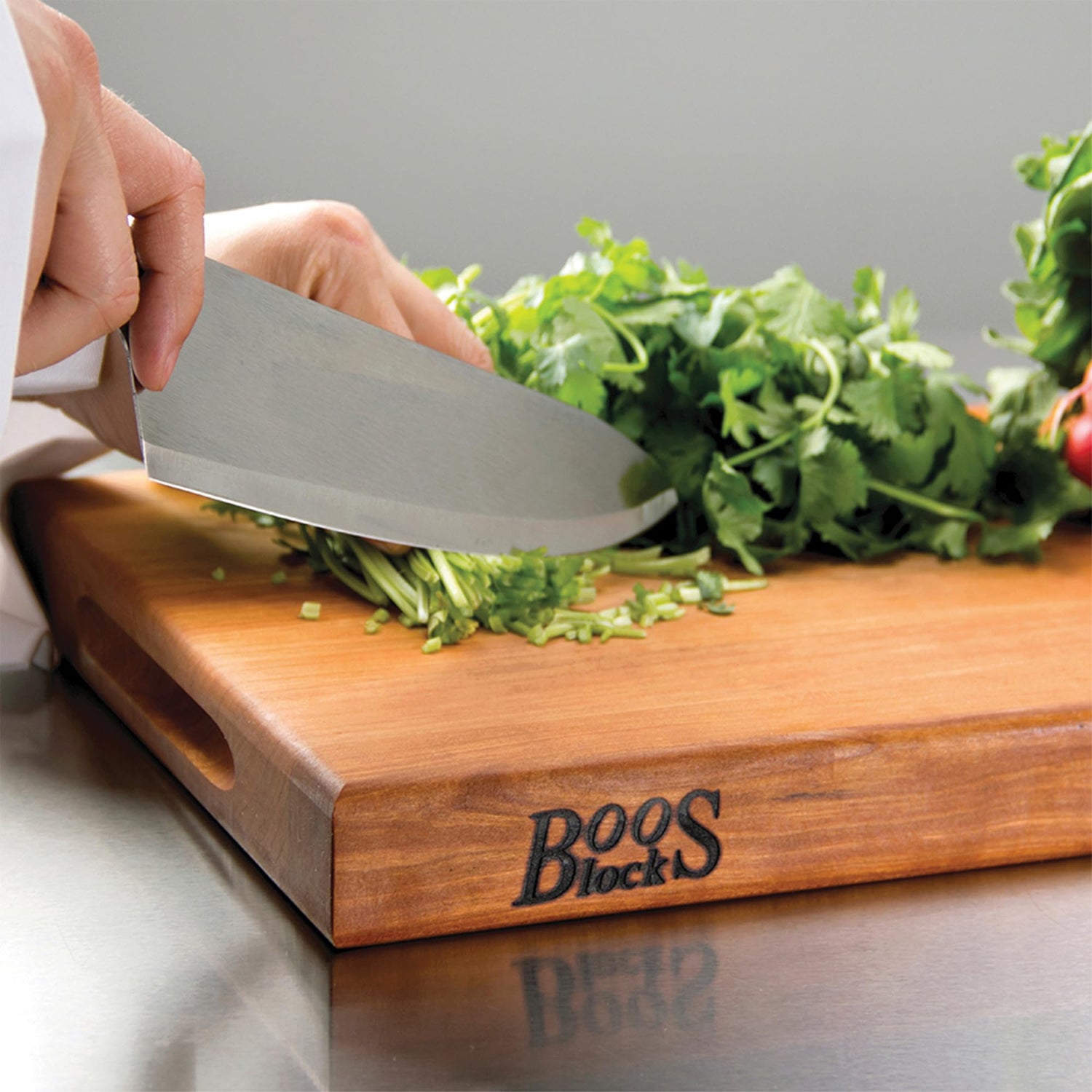Bring home a culinary classic with a RA Board by John Boos. RA Boards are thick and hearty boards and measures an impressive 2.25 inches thick. Each RA board features sleek edge grain construction, resulting in a modern linear grain pattern.John Boos products are designed to meet the demanding expectations of commercial kitchens, and exceed the highest level of quality and food safety standards. Each board and block is made from sustainably harvested North American hardwoods, and offers a commercial grade cutting surface that protects the sharp edge on fine cutlery. Often imitated, John Boos and Co. is internationally known for its expertise in crafting American hardwoods into products of beauty, durability and function.Simple board care can ensure this heirloom, handcrafted board is a favorite in your kitchen for years to come. Every John Boos Board and Block comes with a food safe natural oil finish that helps protect the wood during transit. Once a month, apply an even coat of NSF Approved John Boos Mystery Oil (sold separately), and allow it to soak in overnight. Repeat this process more often when the board is brand new and โthirsty,โ or if you live in a dry, arid climate. John Boos recommends applying John Boos Board Cream (also sold separately) to seal the top of the wood surface after applying the Mystery Oil. A few quick minutes of regular oil application will ensure your new board is properly seasoned, and ready for work! After use, wash board with warm, soapy water (all wooden cutting boards are not dishwasher safe and should not be soaked in water).Since 1887, every genuine John Boos cutting board and butcher block has been proudly made in Effingham, Illinois by skilled craftspeople using time honored techniques. Today, USA made John Boos cutting boards and butcher blocks are used and loved in commercial and home kitchens worldwide. 20X15X2.25 CHY-EDGE GR-REV-RA BRD-
