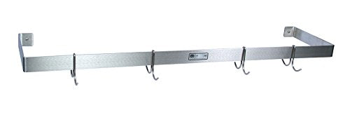 Wall mounted. Rectangular shape. Warranty: One year against manufacturing defects. Made from stainless steel. Polish satin color. Includes hooks. Made in USA. Welded set-up. 2 in. x 0.18 in. flat bar. POT RACK 36"-1 BAR-WALL MNT