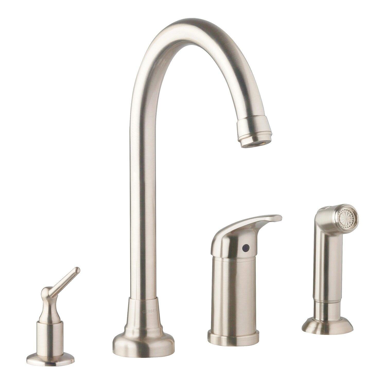 Product DescriptionGerber Plumbing has been manufacturing premium plumbing accessories from shower heads to faucets to china fixtures since 2001. Not only providing necessities, the products include a variety of decorative faucets and bath accessories. Designed with comfort, durability and style in mind, there is no question that this should be your choice when it comes to modern plumbing.From the ManufacturerFor nearly 20 years, the kitchen and bath industry has known Danze as a leader in product design and beautiful styling. What industry professionals and homeowners may not have known is that Danze has a sister company, Gerber - an 85-year-old manufacturer of some of the highest performing, most reliable products on the market. To best meet the diverse and ever-changing needs of home products, Danze has transformed to be Danze by Gerber, a perfect blend of the handcrafted, trusted performance of Gerber on the inside and beautiful design on the outside. The Danze by Gerber product combination can be found in a range of kitchen and bath faucets, bath accessories and shower systems. A thoughtful balance of form and function. Inspired, beautiful design on the outside. Handcrafted, trusted performance on the inside. A combination that results in true value and commitment. You can call it a breath of fresh air. We call it Danze by Gerber. Product Information Product Overview Connection Type: 1/2 -14npsm ConnectionFlow Rate: 1.75gpm Max Aeration/2.2gpm Max Spray @ 60 psiInstallation: 4-Hole InstallationSpray/Stream Function: Matching side spray offers choice between single steady stream and powerful sprayBrand: Gerber Features Cartridge Type: Includes Durable Ceramic Disc Valve for Drip-Free PerformanceSpout Swivel: 360-Degree Swivel SpoutWarranty: Limited lifetime Description The Melrose Single Handle High-Rise Kitchen Faucet with Spray is a kitchen powerhouse and delivers a one-two punch with its matching spray and soap dispenser.Crafted with precision and quality this stainless steel kitchen faucet offers a powerful spray and features a convenient sprayer for added versatility.Experience the perfect balance of design and performance with the Melrose kitchen faucet . Its Air Injection technology optimizes water intensity even at low pressures ensuring a pleasant shower experience every time. The Pressure Manifold technology guarantees wide coverage and a powerful spray while the Easy Clean Soft-Touch Nozzles make maintenance effortless.Upgrade your kitchen with the Melrose Single Handle High-Rise Kitchen Faucet. Discover the elegance and convenience of a stainless steel kitchen faucet with a sprayer. Experience exceptional craftsmanship and transform your culinary space today. Components Includes: Matching Side Spray and Soap Dispenser