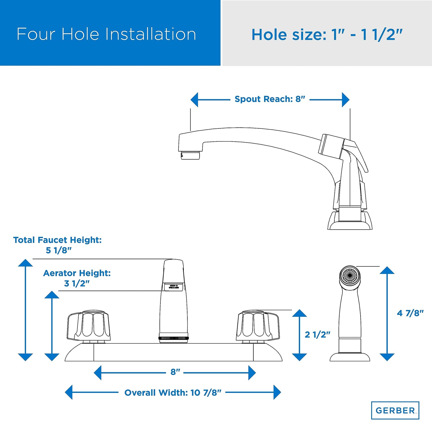 Gerber Classics 2H Kitchen Faucet Deck Plate Mounted w/ Spray & w/ Metal Fluted Handles 1.75gpm Chrome Product Information Product Overview Flow Rate: 1.75gpmInstallation: 4-Hole InstallationBrand: Gerber Features Ada CompliantCast Brass BodyCompression Stems with Renewable Brass SeatsLead Free Waterway per Nsf/ansi 372 Description Gerber offers a complete line of classic faucets for residential multi-family and light commercial use. Gerber Classics deliver practical and consistent performance at a compelling value. With their sturdy construction Gerber Classics install quickly and securely to get the job done right.