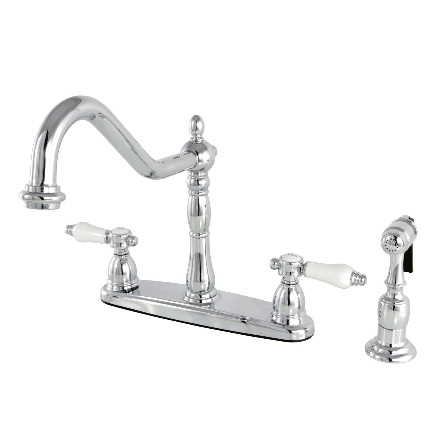 The graceful elegance of timeless design is beautifully merged between British flair and Victorian delicacy within this faucet's white porcelain levers. Easily adaptable to any style, centerset faucets are admired for their single unit and ease of installation. The polished chrome finish will also add a glistening elegance to your kitchen ensemble. A sturdy brass construction and swivel abilities make for a reliant and long lasting fixture. Utilize the included matching finish side-sprayer for convenience in cleaning hard-to-reach areas.
