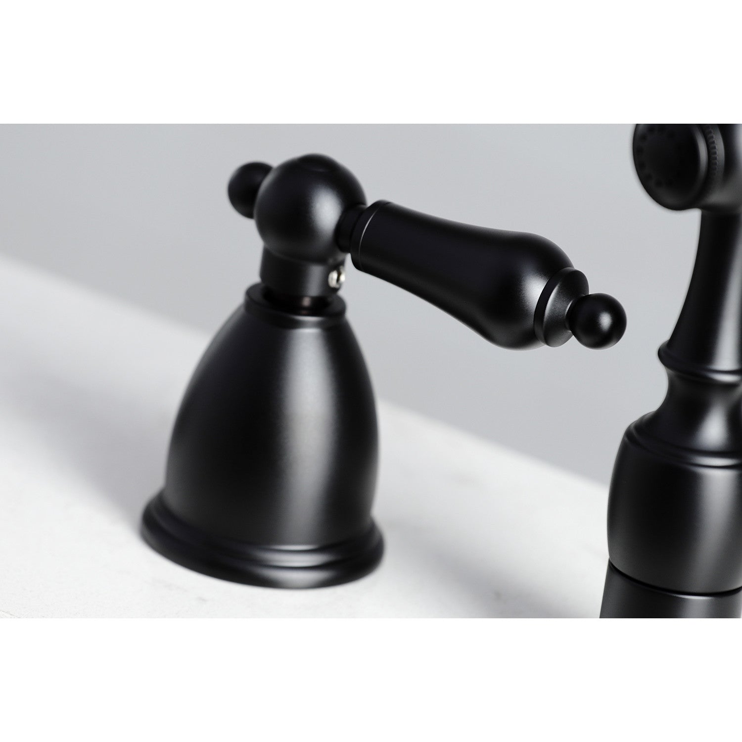 A lavish spark of traditionally stylized glamour is brought to your kitchen ensemble with this beautiful faucet. Able to fit a variety of sink set-ups, widespread kitchen faucets can be utilized in several multi-hole configurations. These are ideal for larger kitchens, as they are more spread apart, and with the included side-sprayer feature a 4-hole installation. The matte black finish will also provide a long lasting and warm touch to your kitchen ensemble. Allow the brass construction to provide a sturdy and reliant fixture.