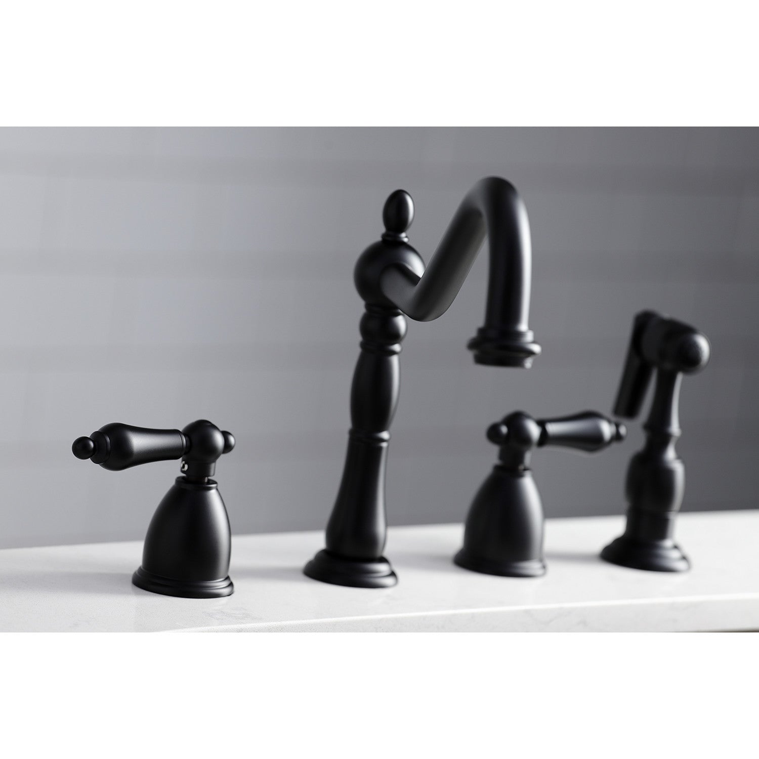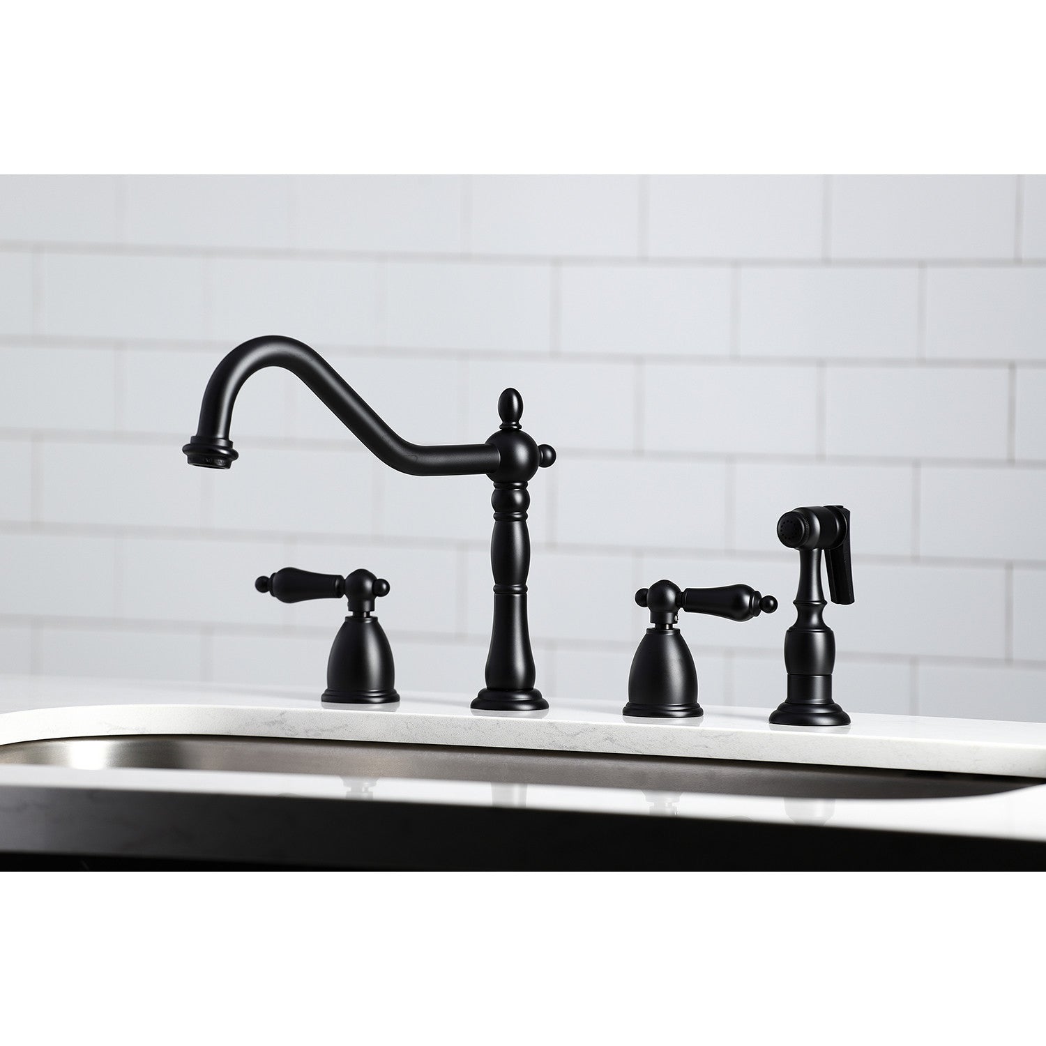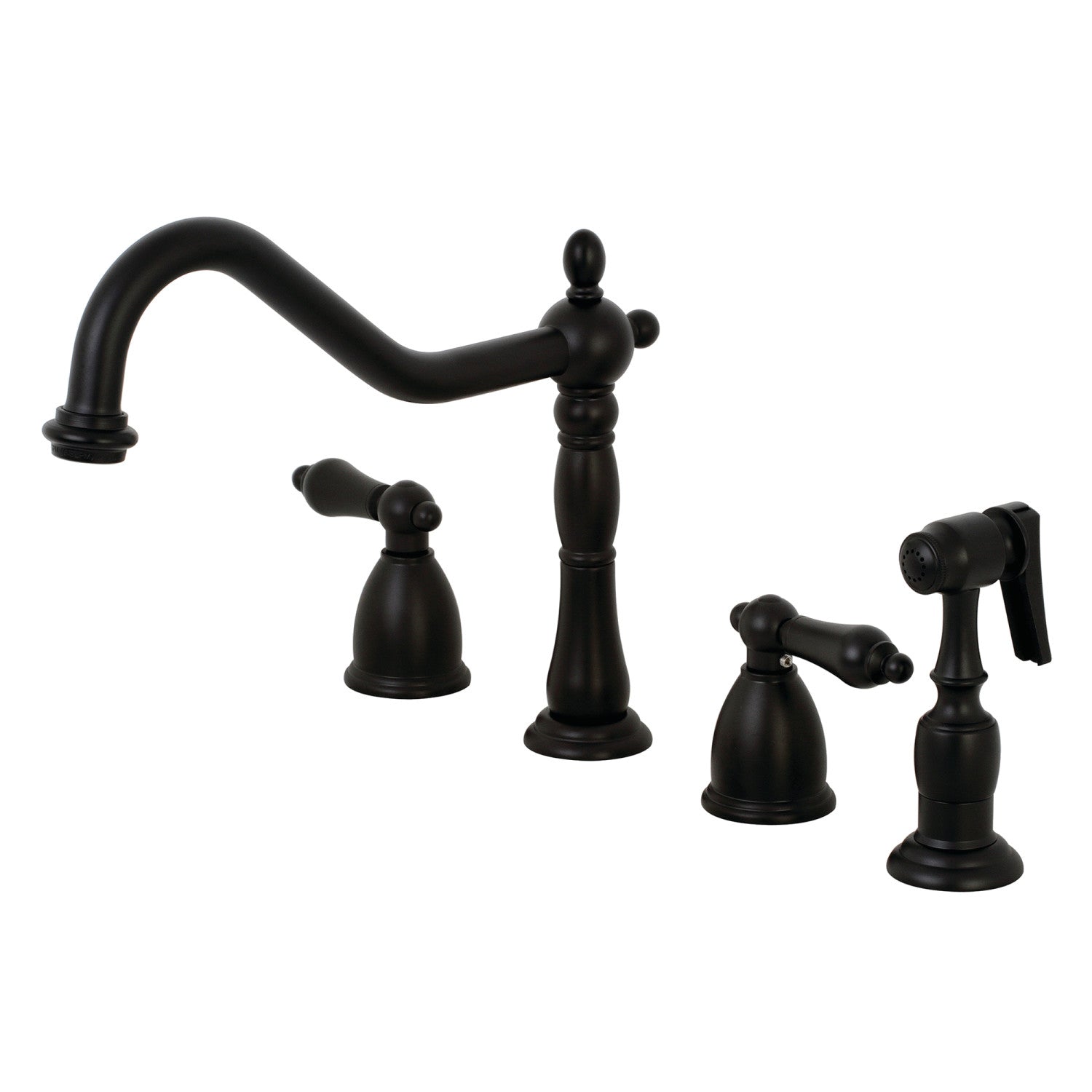 Heritage KB1790ALBS Two-Handle 4-Hole Deck Mount Widespread Kitchen Faucet with Brass Sprayer, Matte Black