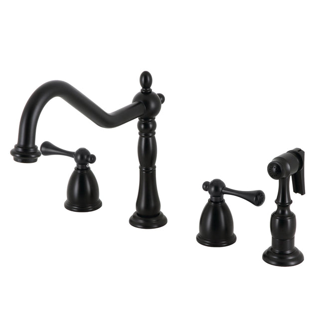 Heritage KB1790BLBS Two-Handle 4-Hole Deck Mount Widespread Kitchen Faucet with Brass Sprayer, Matte Black