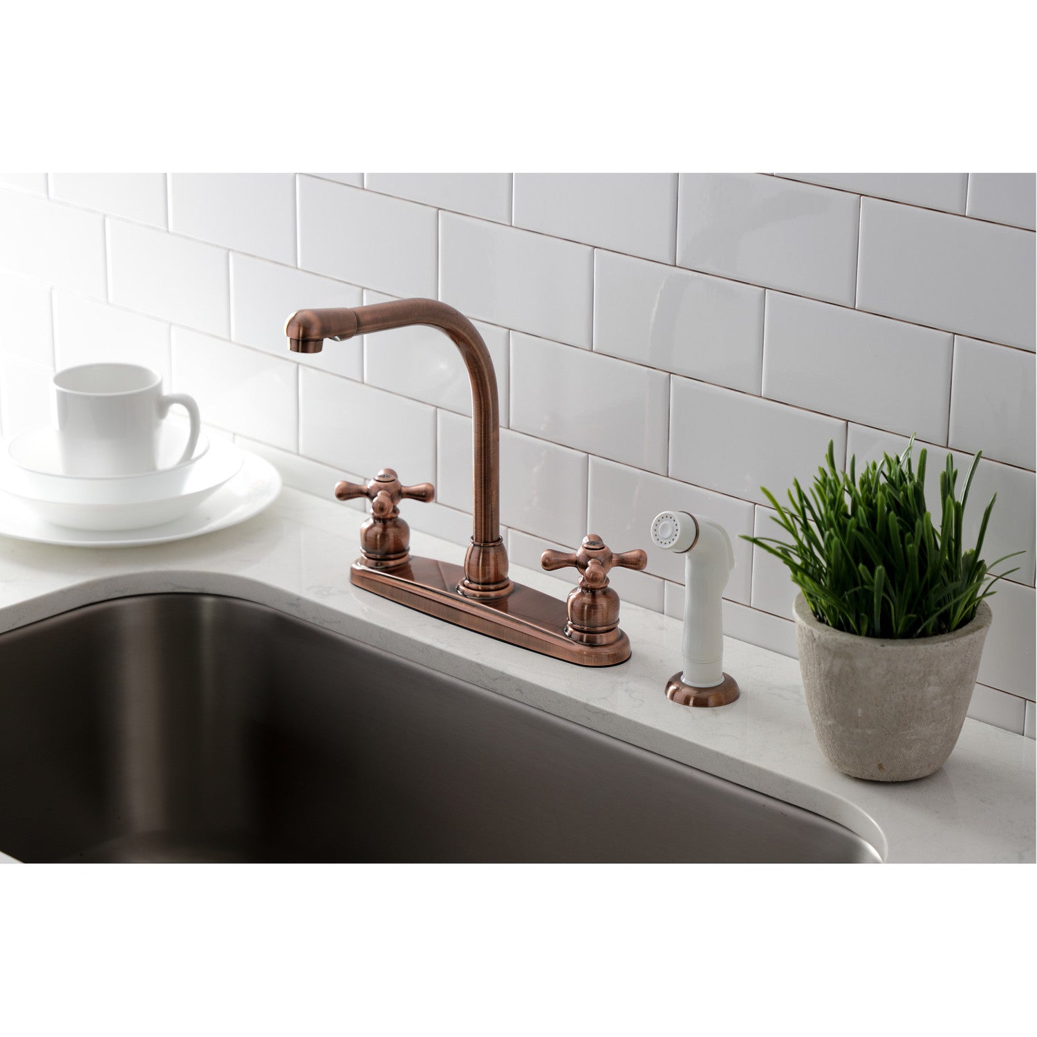 Returning to the nooks and curios of design from the Victorian Era, this faucet breathes modern excellence in performance while radiating vintage opulence. Easily adaptable to any style, centerset faucets are admired for their single unit and ease of installation. The antique copper finish will also provide a long lasting and warm touch to your kitchen ensemble. A sturdy brass construction and swivel abilities make for a reliant and long lasting fixture. Utilize the included matching finish side-sprayer for convenience in cleaning hard-to-reach areas.