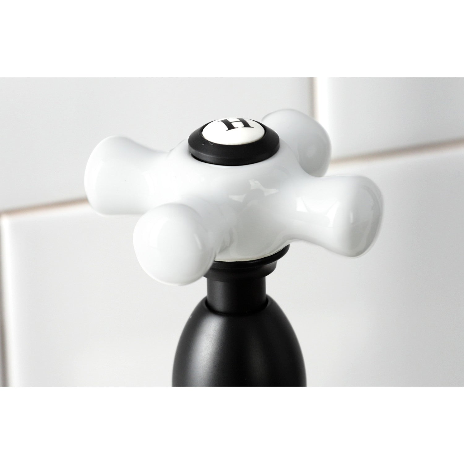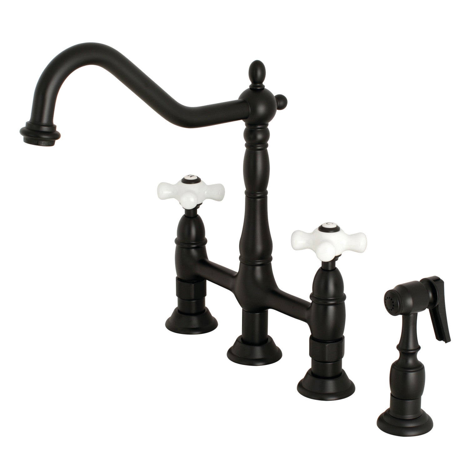 Heritage KS1270PXBS Two-Handle 4-Hole Deck Mount Bridge Kitchen Faucet with Brass Sprayer, Matte Black