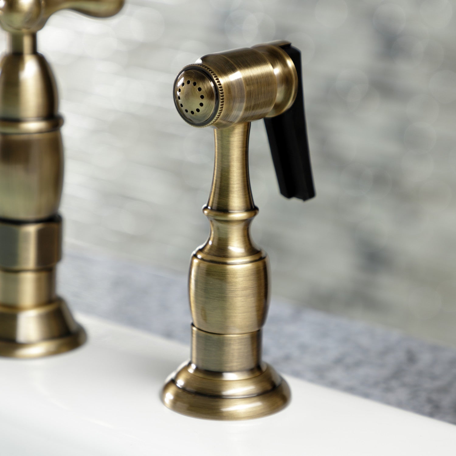 Heritage KS1273AXBS Two-Handle 4-Hole Deck Mount Bridge Kitchen Faucet with Brass Sprayer, Antique Brass