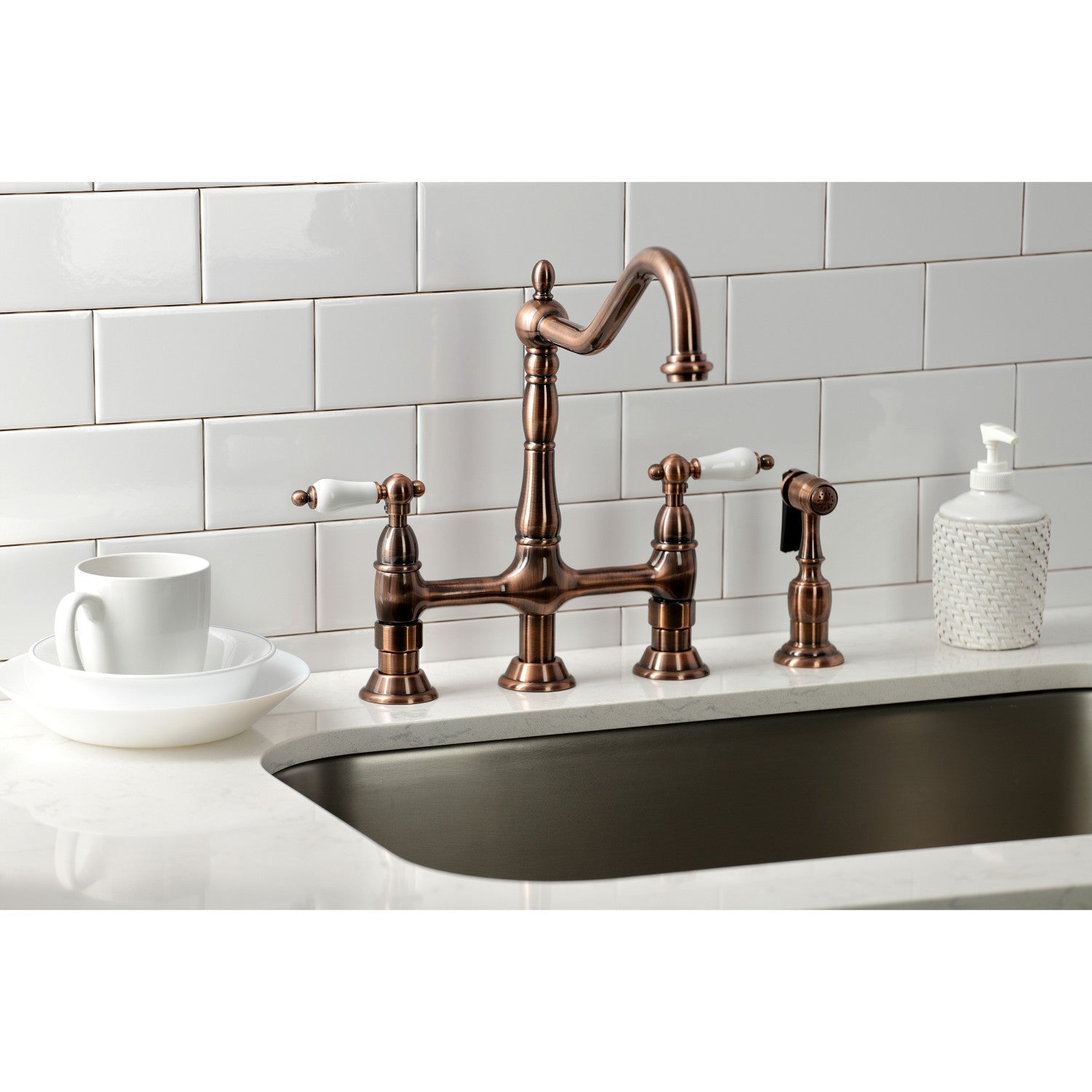 A lavish spark of traditionally stylized glamour is brought to your kitchen ensemble with this beautiful faucet. Whether you are striving for a Victorian-inspired kitchen or a vibrant 1950s-themed space, the unique bridge design is a highly favored option amongst those doing period-style kitchens. Because of its added architectural elements and detailing, the antique copper finish will pop against your surrounding kitchen decor. Allow the brass construction, side sprayer, and swivel abilities to provide a sturdy and reliant fixture, great for use with any sink.