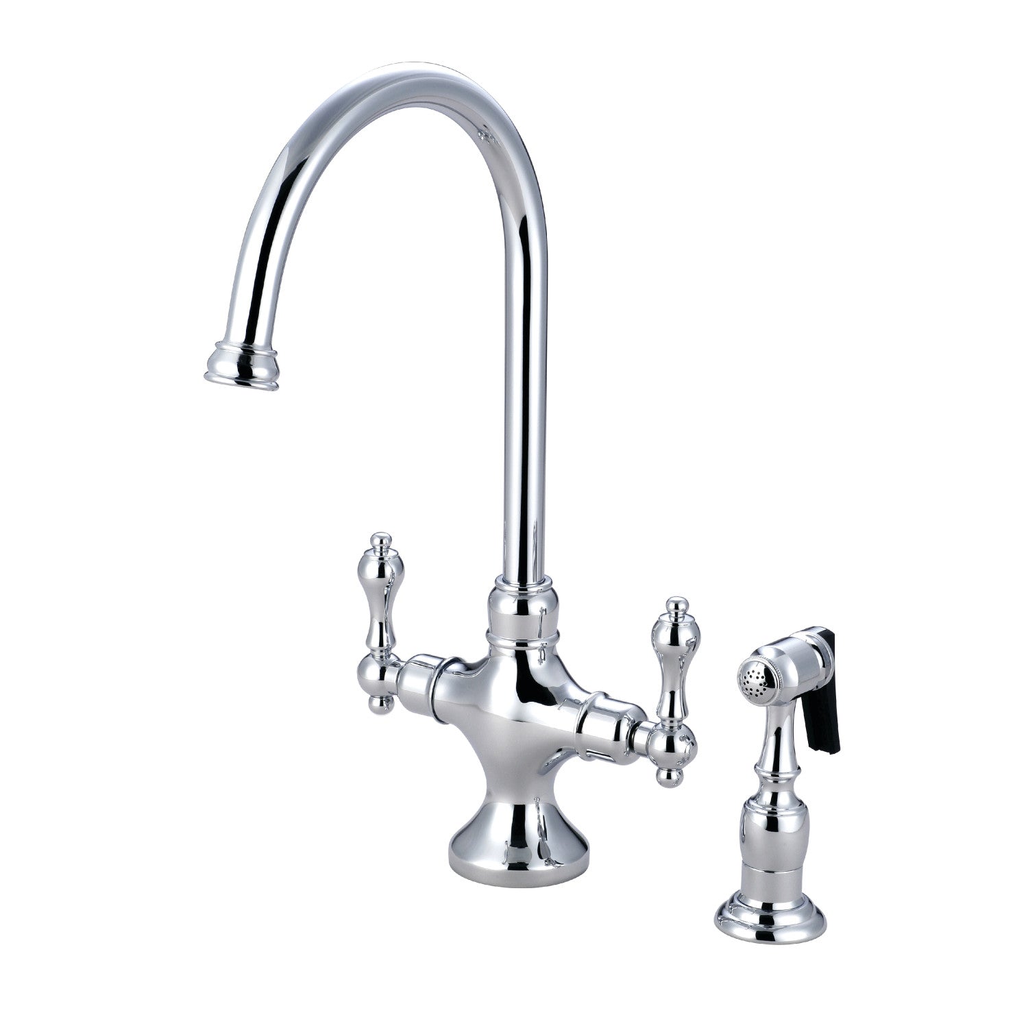Return to the antique designs of the early 20th Century with this faucet, offering detailings of refined splendor and ornate design to your home. For a streamlined yet glamorous look, two-handle single-hole kitchen faucets are a practical and fashionable design. Additionally, the polished chrome finish is guaranteed to embellish your home's traditional ensemble for years to come as it adds a glistening elegance. Allow the brass construction to provide a sturdy and reliant fixture. Utilize the included matching finish side-sprayer for convenience in cleaning hard-to-reach areas.