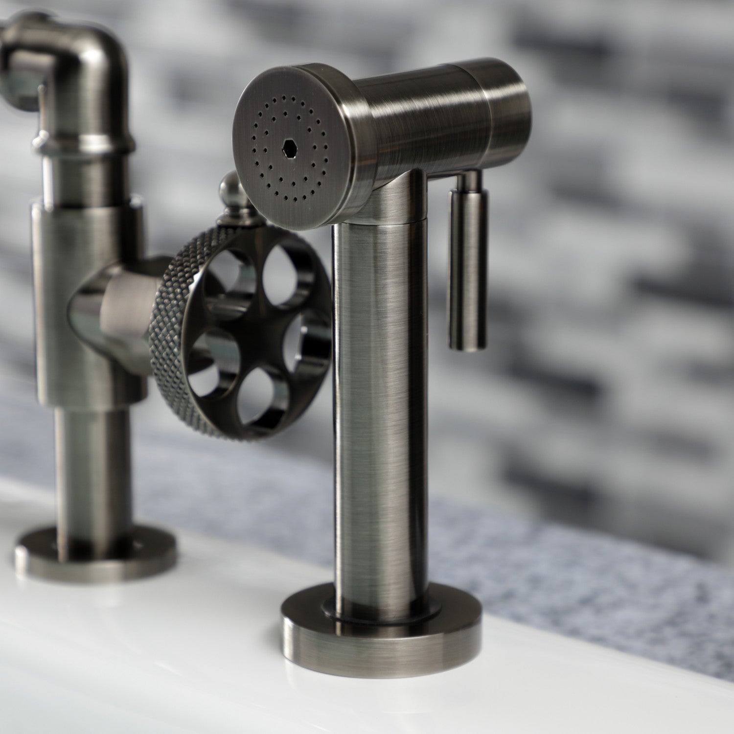 Webb KS2334RKX Two-Handle 4-Hole Deck Mount Bridge Kitchen Faucet with Knurled Handle and Brass Side Sprayer, Black Stainless