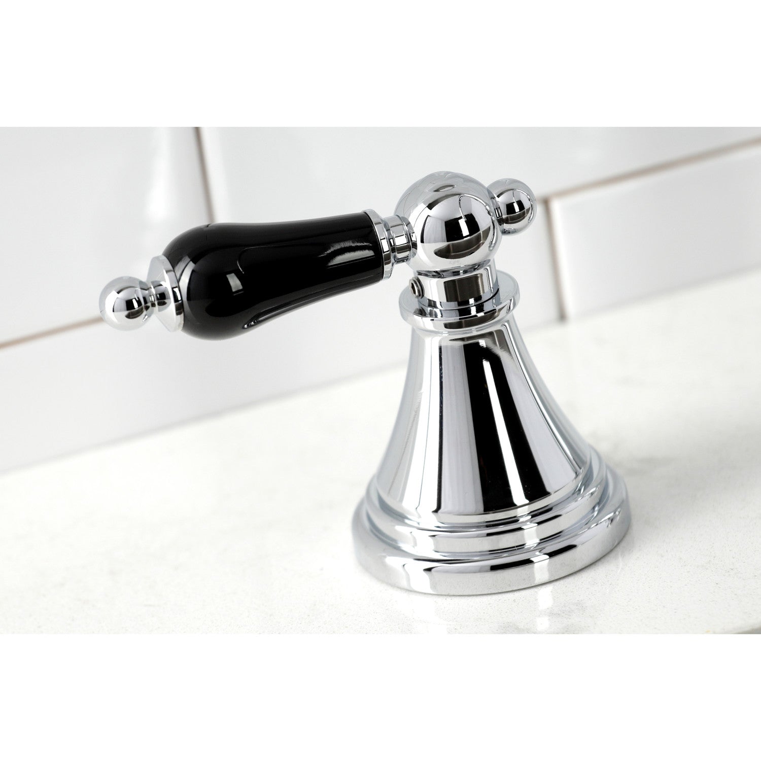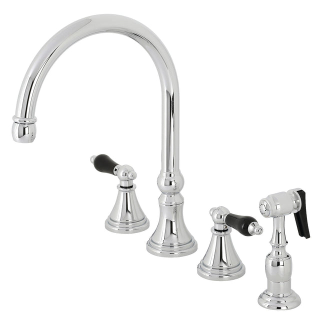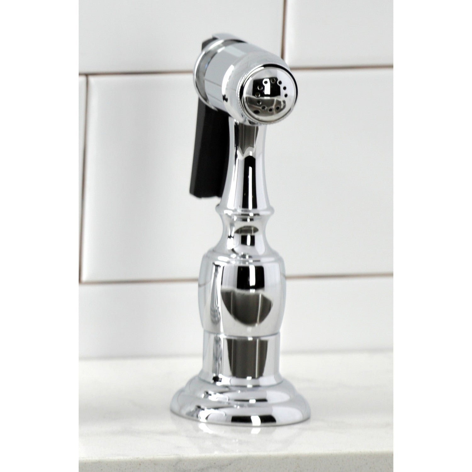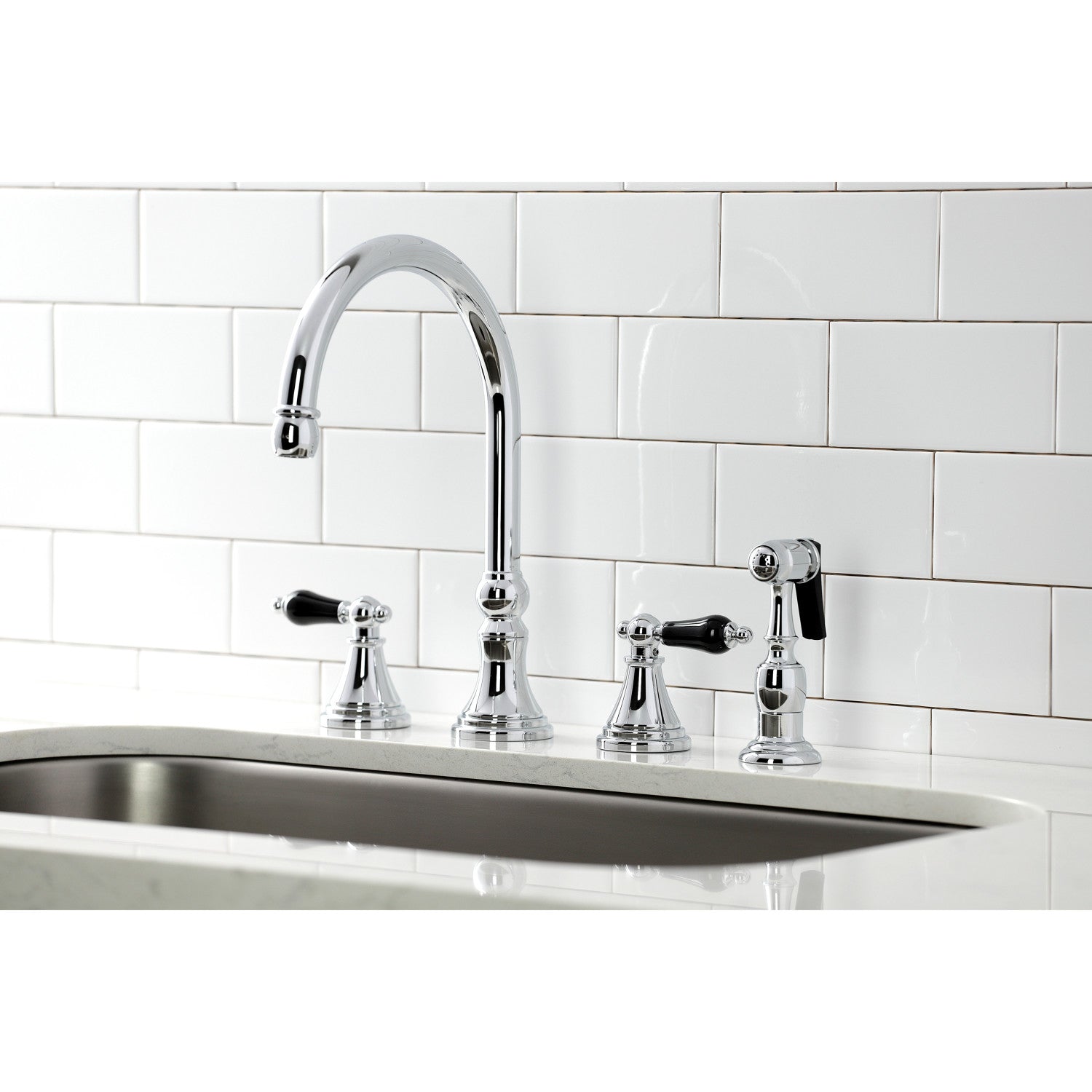 Crafted in commendations to English nobility, the exemplary design of this faucet manifests regality and elegance with its black porcelain handles. Able to fit a variety of sink set-ups, widespread kitchen faucets can be utilized in several multi-hole configurations. These are ideal for larger kitchens, as they are more spread apart, and with the included side-sprayer feature a 4-hole installation. The polished chrome finish will also add a glistening elegance to your kitchen ensemble. Allow the brass construction to provide a sturdy and reliant fixture. Utilize the included matching finish side-sprayer for convenience in cleaning hard-to-reach areas. Glamorize your home today with the traditional elegance of this faucet.