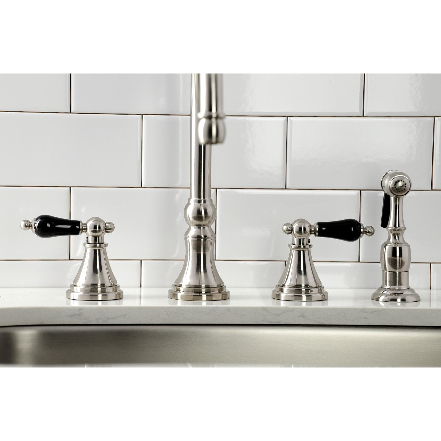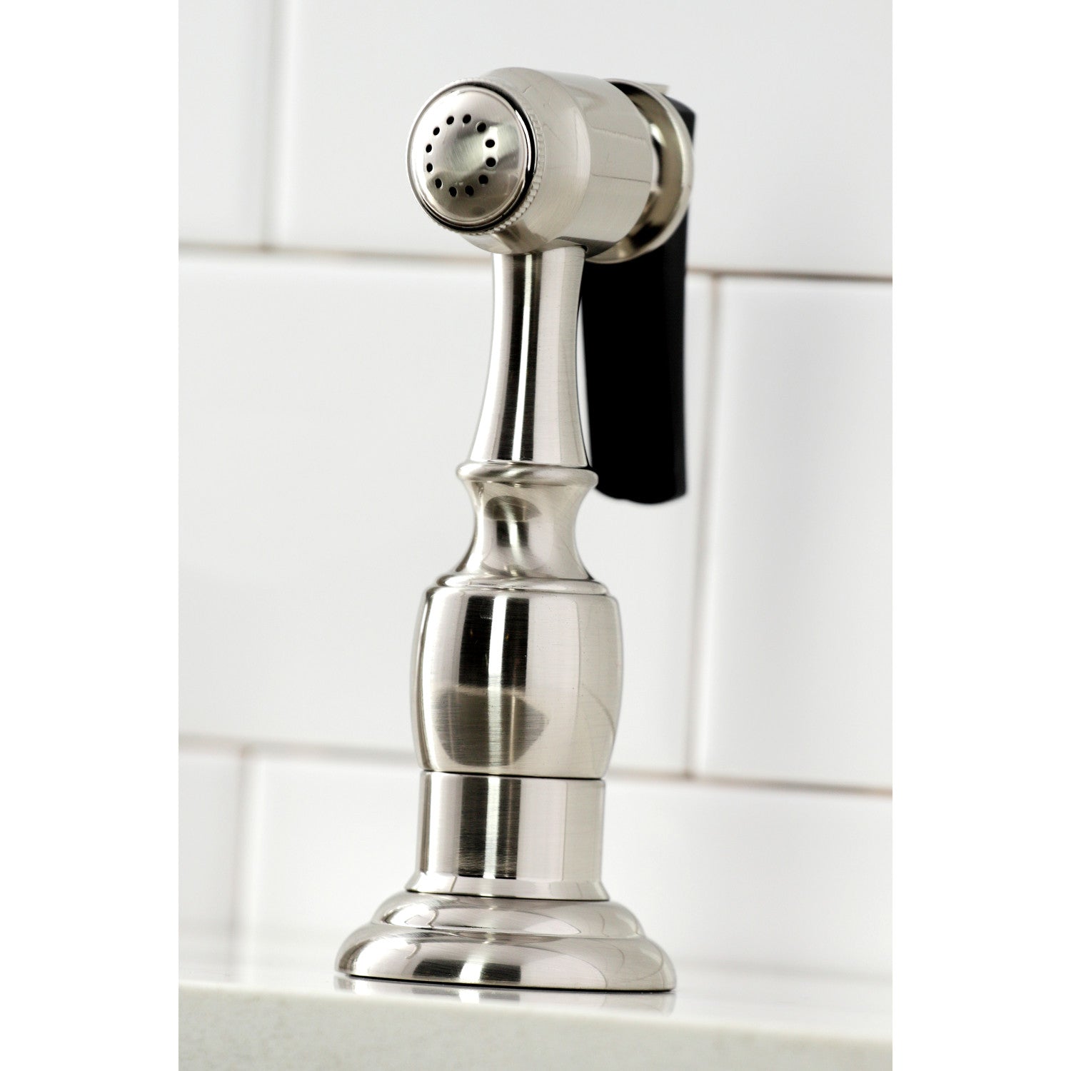Crafted in commendations to English nobility, the exemplary design of this faucet manifests regality and elegance with its black porcelain handles. Able to fit a variety of sink set-ups, widespread kitchen faucets can be utilized in several multi-hole configurations. These are ideal for larger kitchens, as they are more spread apart, and with the included side-sprayer feature a 4-hole installation. The brushed nickel finish will also provide a long lasting and warm touch to your kitchen ensemble. Allow the brass construction to provide a sturdy and reliant fixture. Utilize the included matching finish side-sprayer for convenience in cleaning hard-to-reach areas. Glamorize your home today with the traditional elegance of this faucet.