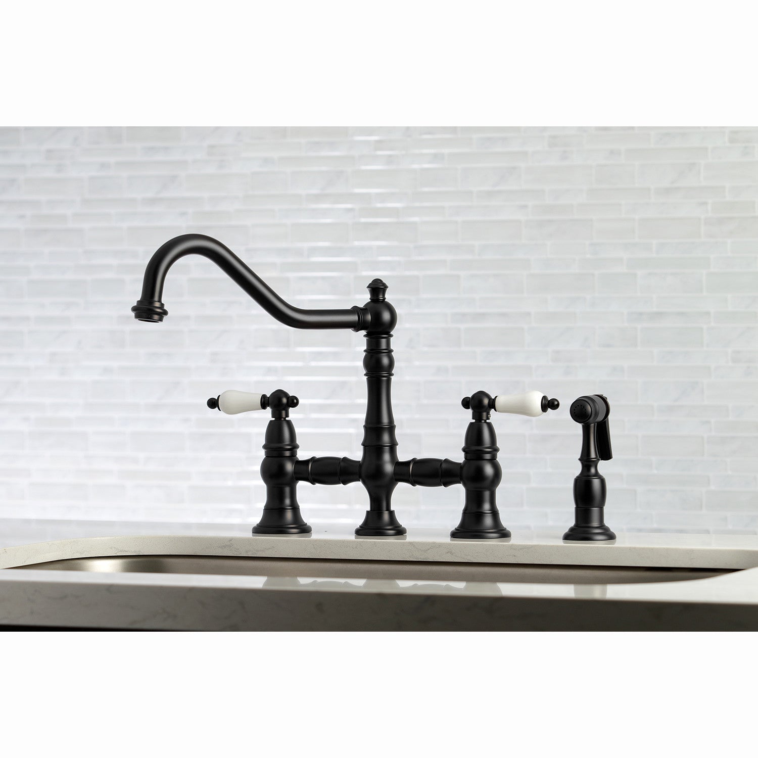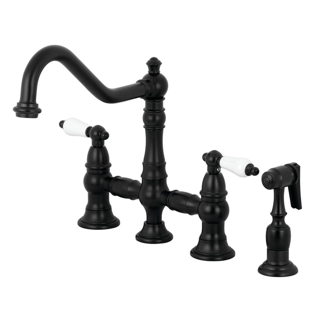 Restoration KS3270PLBS Two-Handle 4-Hole Deck Mount Bridge Kitchen Faucet with Side Sprayer, Matte Black