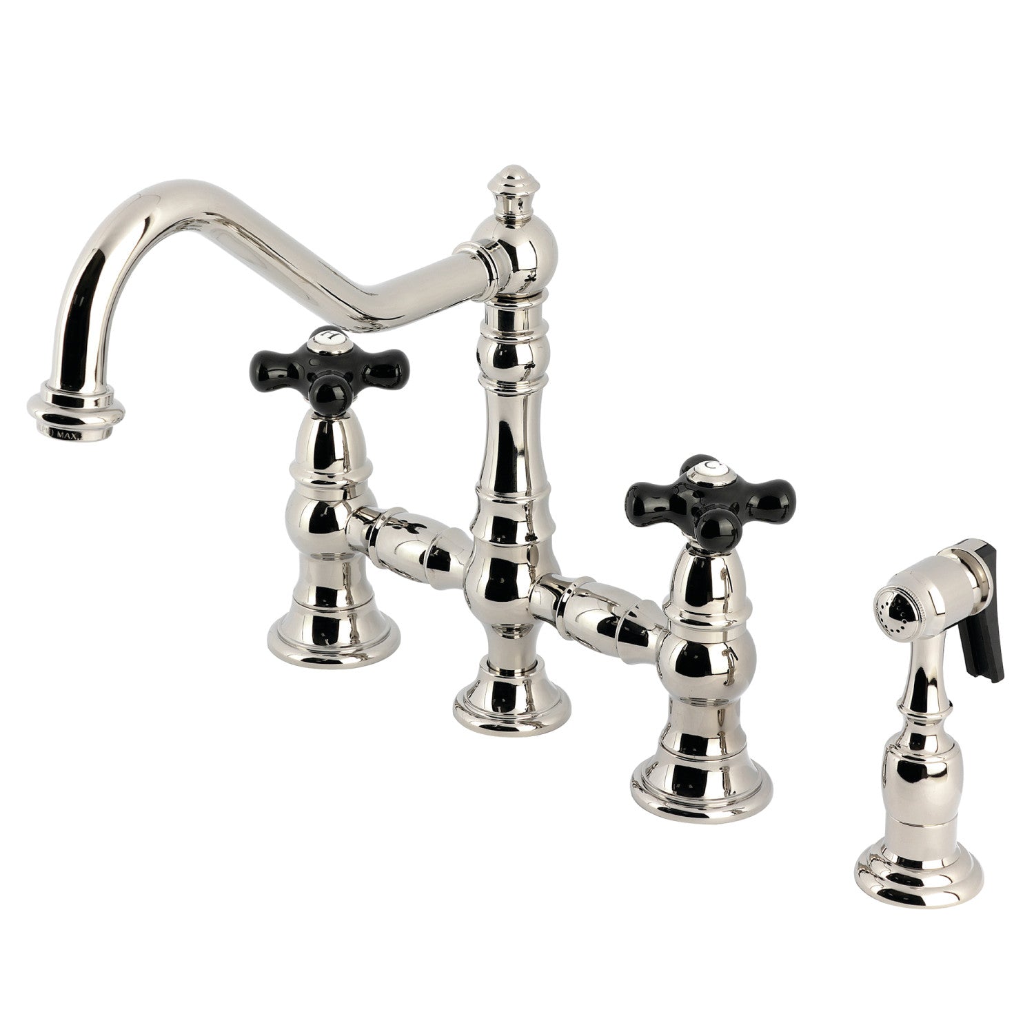 Crafted inspired by English nobility, the exemplary design of this faucet manifests regality and elegance with its black porcelain handles. Allow the brass construction, side sprayer, and swivel spout to provide a sturdy and reliable fixture, great for use with any sink. If you are striving for a Victorian-inspired kitchen, this unique bridge design is a highly favored option amongst those doing period-style kitchens. Because of its added architectural elements and detailing, the stunning finish will pop against your surrounding kitchen decor.